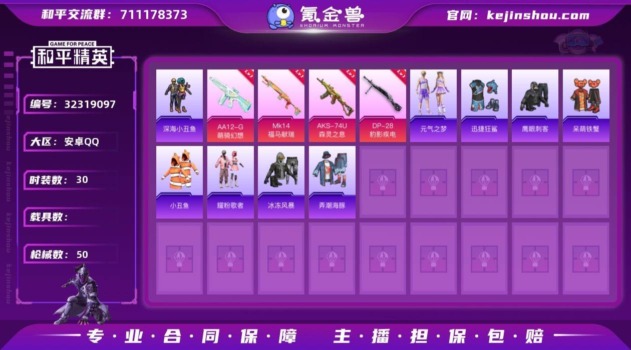 M1046880【可二次 地铁满天赋身法号4特效枪深海小丑鱼,小丑鱼】安卓手Q-4特效枪-30套装-50枪皮-0王牌印记-荣耀皇冠Ⅴ-12985热力值【4特效枪】DP-28-豹影疾电[5级],AA12-G-萌骑幻想[4级],Mk14-福马献瑞[5级],AKS-74U-森灵之息[4级]【3稀有】深海小丑鱼,小丑鱼,AKM-缤纷海域【3飞行器】马上有福飞行器,炫彩糖果飞行器,极意拳锋飞行器【1头盔】深海小丑鱼头盔【1背包】深海小丑鱼背包【73其它衣服和枪皮】耀粉歌者,鹰眼刺客,龙的传人,青翼流星,马上有钱,玲珑侠影,萌鸡速递,完美偶像,福马献瑞,猎鹰,冰冻风暴,迅捷狂鲨,炫彩糖果,呆萌铁蟹,雨过天青,红釉青花,海岛探路者,弄潮海豚,魅力单车,元气之梦,雪国风尚,狙击之神,SS36特训,青年教官,SS37特训,旭日情侣,元素星魂,湖蓝色名流,MG-36-薄荷星砂,UZI-炫彩糖果,GROZA-福马献瑞,SPAS-12-狂鲨锋刃,信号枪-异瞳寒姬,M16A4-雨过天青,M24-炫彩节奏,蜜獾-启元战纹,SCAR-L-玉兔迎春,MG3-幻世战舞者,铝热弹-炫彩糖果,Mini14-穿刺龙虾,Mk14-冰河战士,AMR-雨过天青,Kar98K-影袭,沙漠之鹰-雨过天青,破片手榴弹-拽到爆炸,SKS-迅猛狂鲨,GROZA-紫矿核心,M24-影袭,SCAR-L-红色方程式,S12K-霓彩脉冲,P90-紫矿核心,AUG-冰晶雪宝,汤姆逊-像素花束,撬棍-冰...