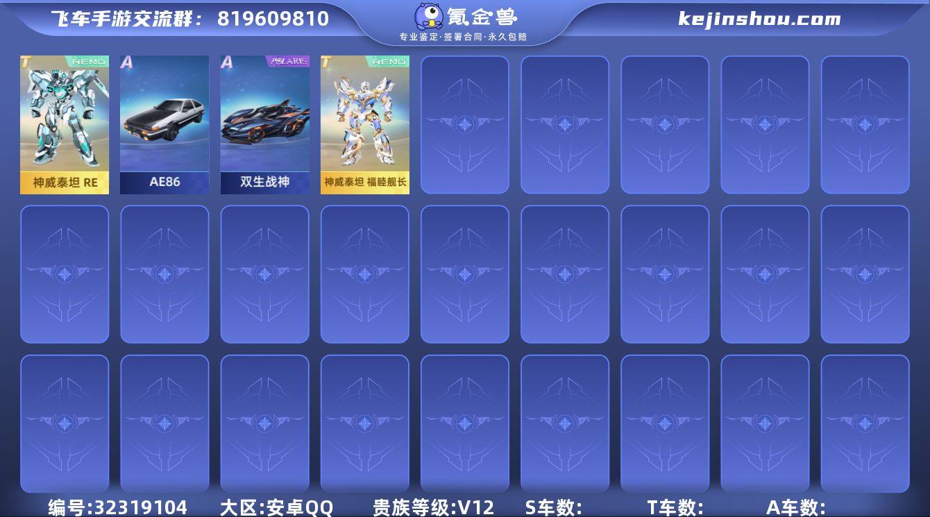 B653564 【v12/神威泰坦福睦舰长【冰蓝圣甲】稀有车型:双生战神】 A车数量36 游戏等级70 【否】 【可二次实名】 【永久包赔】 【安卓QQ】 稀有车型1 T车皮肤1 永久T车2 稀有车型:双生战神; T车皮肤:神威泰坦福睦舰长; 永久T车:鸭宝超人,神威泰坦RE;