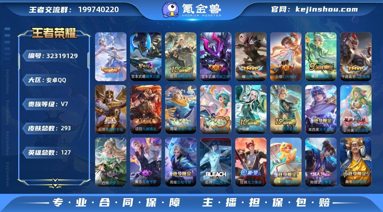 【WZ181335】安卓Q-V7-最强王者段位-127英雄-293皮肤-1典藏皮肤-9传说-88史诗【英雄全皮】:影全皮【荣耀典藏】:伽罗最初的交响【传说皮肤】:云缨神骥越千峰,狄仁杰神骥赴朔漠,后羿神树通天,云缨幻光神枪,桑启鸣野蒿,曜云鹰飞将,干将莫邪久胜战神,后羿黄金射手座,宫本武藏地狱之眼【限定皮肤】:蒙犽顽岩魄,蔡文姬夏日便利店,大乔绒语心约,虞姬夏日便利店,姜子牙天穹之誓,狄仁杰阴阳师,赵云皇家上将,孙尚香蔷薇恋人,阿轲迷踪丽影,钟无艳超时空战士,扁鹊奇幻香踪,芈月白晶晶,元歌云间偶戏,元歌无心,甄姬落雪兰心,典韦蓝屏警告,马可波罗山海玄木吟,狄仁杰魔术师,达摩沙漠行僧,项羽海滩派对,韩信飞衡,韩信傲雪梅枪,王昭君午后时光,兰陵王驯魔猎人,兰陵王金庭之子,孙悟空至尊宝,李元芳云中旅人,杨戬潮玩骑兵,雅典娜黎明之约,鬼谷子五谷丰年,百里玄策原初追逐者,沈梦溪大漠名商,裴擒虎擒涛扼浪,狂铁电玩高手,上官婉儿神器万象笔,嫦娥暖冬兔眠,鲁班大师探海日志,桑启海盐诗旅,暃星界游侠,艾琳女武神,阿古朵江河有灵,张良古海寻踪,高渐离燃音魔法,妲己灵卜魔法,鬼谷子天穹祈灯,伽罗琥珀纪元,安琪拉乘龙聚宝船,沈梦溪龙舞盛...
