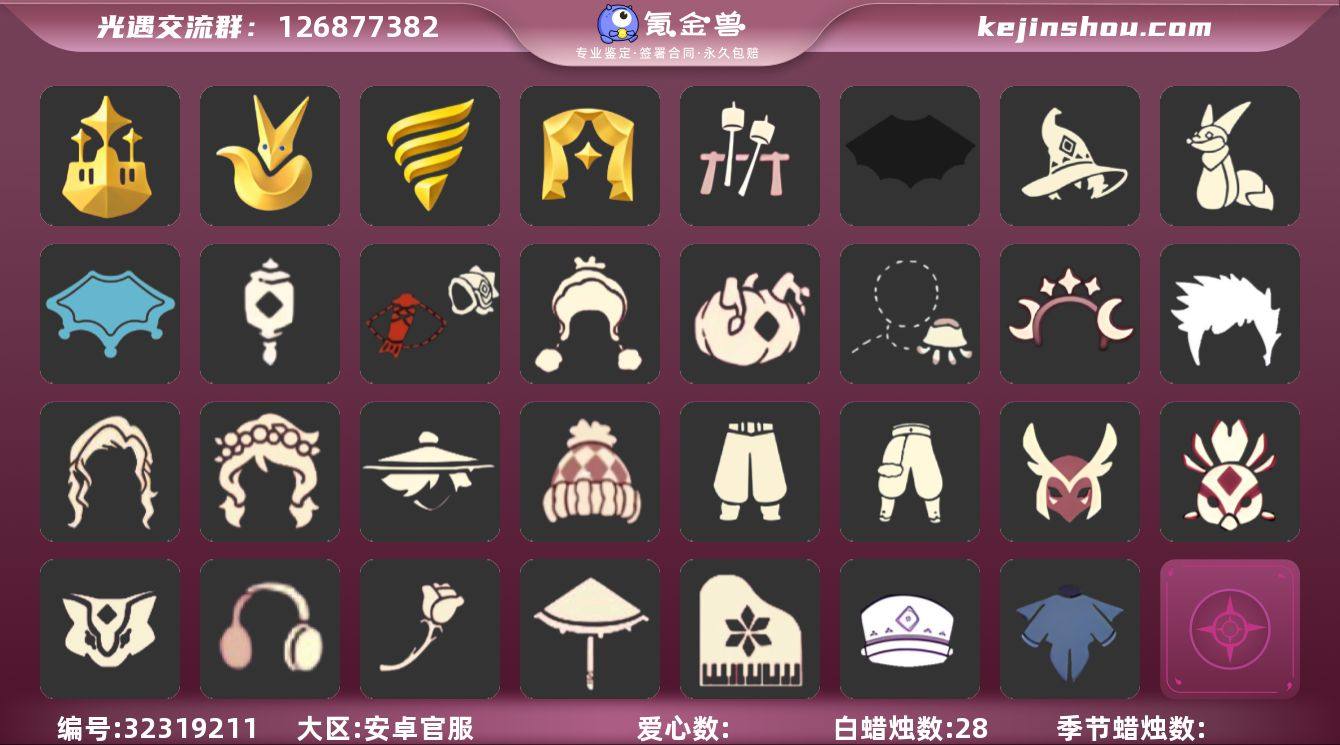蜡烛数:28/爱心数:10/云野/雨林/霞谷/墓土/禁阁/梦想季/小王子季/潜海季/表演季/凤凰面具/凤凰斗篷/小王子发型/小王子套装/玫瑰花/蓝黄羽袖/单边小辫/黄眉企鹅面具/燕尾斗篷/合奏挂画/神鹿祝福礼包/水母/绒帽/巫师/鲤鱼套/星月头饰/巫树犄角/圣诞鹿角/南瓜/年年有鱼礼包/蝙蝠套/蛛网斗篷/瑞雪/白雪斗篷/音韵吉他/灯笼/花憩茶桌/小憩茶桌/小狐狸/冥龙南瓜/篝火点心礼包/武士裤/搓澡巾/虚荣/花环/红耳机/若笠/平顶帽/白金斗篷/红金斗篷/雨伞/高音钢琴/黄鼠狼/星月头冠/水母肩饰/猫猫头/花环长发/帝企鹅发/贝壳发饰/玉兔发饰/雪花发夹/创始人斗篷/小王子围巾/雪花水晶球/篝火点心/情人秋千/中秋灯笼