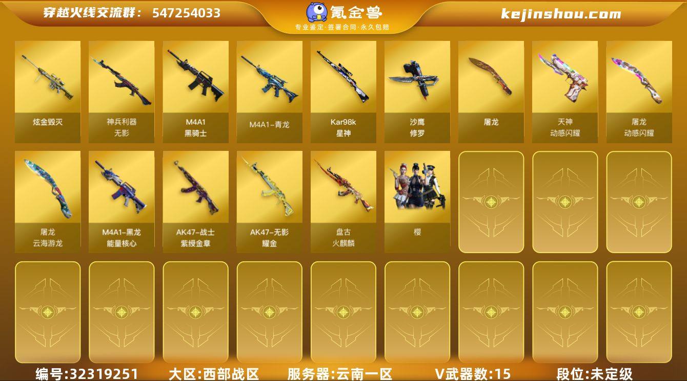 云南一区-17V-0王者武器数-2炫金武器数 【热门武器】:M4A1-青龙,Kar98K-星神,M4A1-黑骑士,加特林-炼狱,沙鹰-修罗 【王者炫金武器】:炫金毁灭*2 【皮肤】:火麒麟-盘古,黑龙-能量核心,无影耀金皮肤,战神-紫绶金章皮肤 【角色】:樱,奇洋探员,乔伊教练,修道士,云海玲珑,幻面灵狐,暗夜-X,风暴女,虎妞,嘉年华灵狐,娟娟,灵狐者-X,灵狐者-黄金海岸,麻雀,潘多拉-X,潘多拉-甜心教官,潜龙队-X,青霞仙子,斯沃特-X,蜀雪,影武者-X 【人偶武器】:天龙-曼陀罗,巴雷特-零-水下丽影,迷你地狱终结者,AWM-灵狐-15周年嘉年华,迷你牛牛,深渊终结者手雷*2 【挑战大师】:冰龙粉碎者-白马银枪,激光毁灭者III-白马银枪,神圣爆裂者-末日III,阐释者III 【英雄级武器】:M4A1-黑骑士,M4A1-青龙,无影-神兵利器,Kar98K-星神,加特林-炼狱,沙鹰-修罗,天神-动感闪耀,屠龙,屠龙-动感闪耀,屠龙-云海游龙,屠龙-电竞之星,手雷-动感闪耀 【源级武器】:源-千变,源·雷神,魂·雷神-神秘按键,御·雷神-烈虎,源·黑骑士,魂·黑骑士-摸金校尉,源·AK47-黑武士,源·天启,M4A1-青龙-掌上穿越火线,魂·HK417-朱雀-凤灵,源·HK417-朱雀,源-金色蔷薇*2,AWM-裁决-百城联...