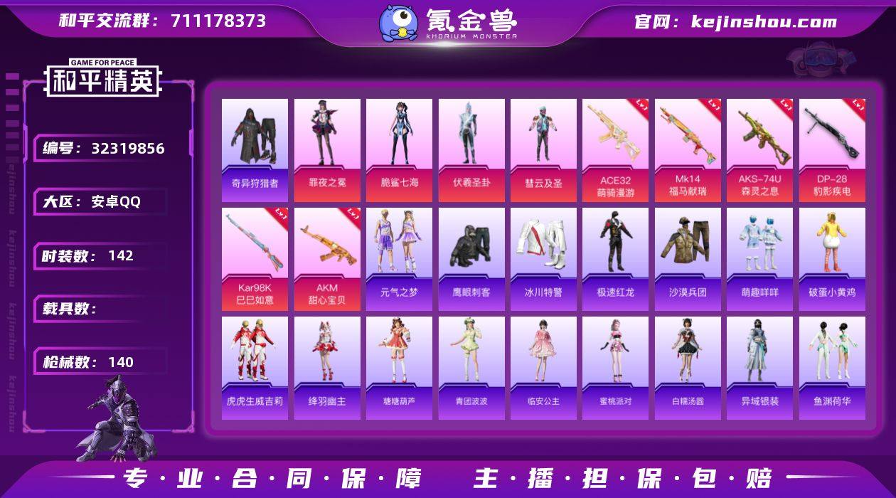 M1046885【4粉装-6特效枪AKM-甜心宝贝[7级]奇异狩猎者,浪漫天命,小丑鱼】安卓手Q-4粉装-6特效枪-142套装-140枪皮-12王牌印记-绝世王牌12星-47503热力值【4粉装】彗云及圣,角色-罪夜之冕,角色-伏羲圣卦,角色-脆鲨七海【6特效枪】DP-28-豹影疾电[5级],Mk14-福马献瑞[5级],AKM-甜心宝贝[7级],AKS-74U-森灵之息[5级],ACE32-萌骑漫游[5级],Kar98K-巳巳如意[5级]【3稀有】奇异狩猎者,浪漫天命,小丑鱼【4飞行器】辉光之愿飞行器,云朵驼驼飞行器,异域银装飞行器,马上有福飞行器【2头盔】甜心宝贝头盔,火曜朱雀头盔【269其它衣服和枪皮】夏日音浪,萌趣咩咩,冰川特警,橘黑制服,绯格组合,湖蓝色名流,北国孤狼,SS37特训,角色-罗莉,飞行日记,竞技名士,雪山征服者,传奇侦探,SS22特训,特种颜团子,海岛探路者,竞技勇士朋克,SS12特训,破晓战魂,战地督导,黄色伏地魔,SS34特训,糖糖葫芦,灼焰舞者,马上有钱,金鼠迎春,鹰眼刺客,红釉青花,冷焰舞者,角色-X,蓝色守护者,战术大师,猎鹰,长空猛禽,阳光火鸡,雨过天青,摩艾涂鸦,狙击之神,幻影武者,角色-暖阳柴柴,黄色名流,人气偶像,异域银装,SS5特训,白糯汤圆,甜心亚梦,都市魅力,SS15特训,SS16特训,青年教官,角色-绛羽幽主,耀粉歌者,幻世尖兵,街头潮人,原初...