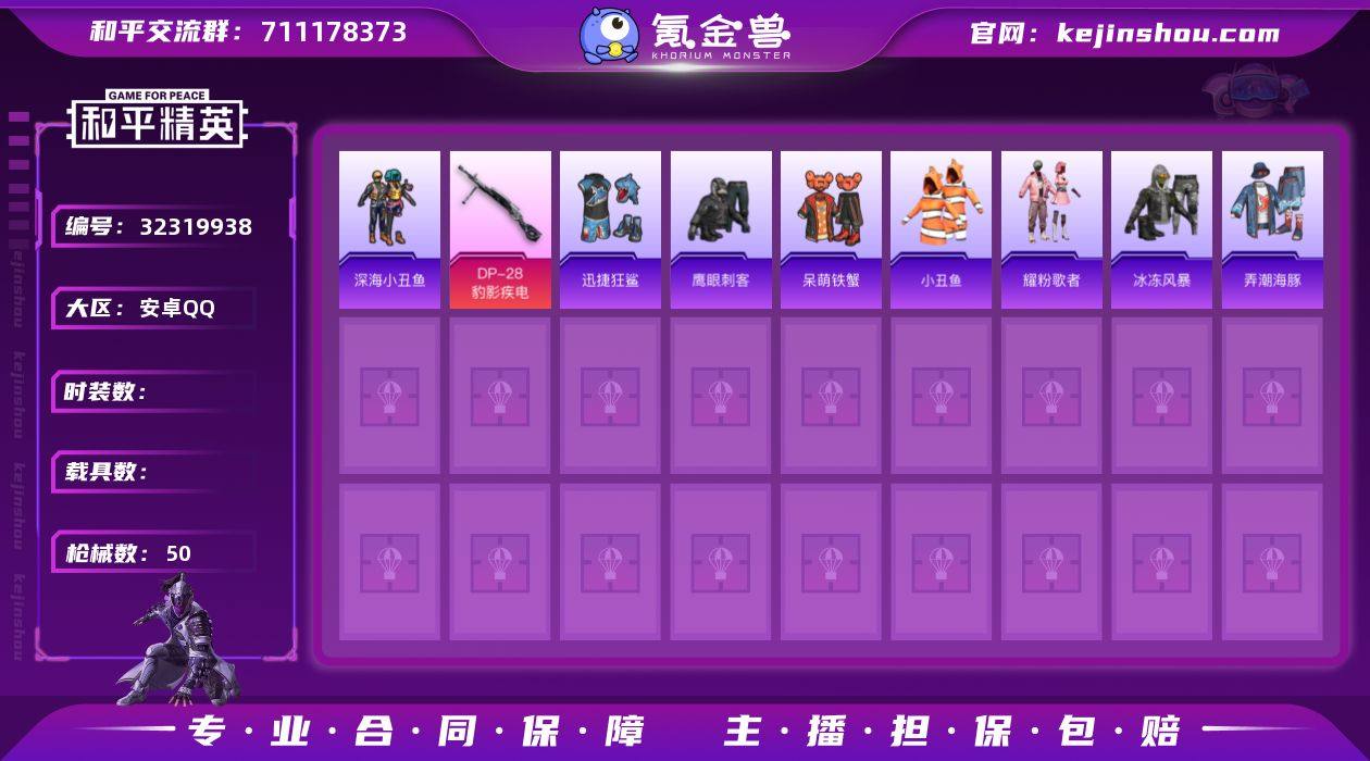 M1046880【可二次 地铁满天赋身法号4特效枪深海小丑鱼,小丑鱼】安卓手Q-4特效枪-30套装-50枪皮-0王牌印记-荣耀皇冠Ⅴ-12985热力值【4特效枪】DP-28-豹影疾电[5级],AA12-G-萌骑幻想[4级],Mk14-福马献瑞[5级],AKS-74U-森灵之息[4级]【3稀有】深海小丑鱼,小丑鱼,AKM-缤纷海域【3飞行器】马上有福飞行器,炫彩糖果飞行器,极意拳锋飞行器【1头盔】深海小丑鱼头盔【1背包】深海小丑鱼背包【73其它衣服和枪皮】耀粉歌者,鹰眼刺客,龙的传人,青翼流星,马上有钱,玲珑侠影,萌鸡速递,完美偶像,福马献瑞,猎鹰,冰冻风暴,迅捷狂鲨,炫彩糖果,呆萌铁蟹,雨过天青,红釉青花,海岛探路者,弄潮海豚,魅力单车,元气之梦,雪国风尚,狙击之神,SS36特训,青年教官,SS37特训,旭日情侣,元素星魂,湖蓝色名流,MG-36-薄荷星砂,UZI-炫彩糖果,GROZA-福马献瑞,SPAS-12-狂鲨锋刃,信号枪-异瞳寒姬,M16A4-雨过天青,M24-炫彩节奏,蜜獾-启元战纹,SCAR-L-玉兔迎春,MG3-幻世战舞者,铝热弹-炫彩糖果,Mini14-穿刺龙虾,Mk14-冰河战士,AMR-雨过天青,Kar98K-影袭,沙漠之鹰-雨过天青,破片手榴弹-拽到爆炸,SKS-迅猛狂鲨,GROZA-紫矿核心,M24-影袭,SCAR-L-红色方程式,S12K-霓彩脉冲,P90-紫矿核心,AUG-冰晶雪宝,汤姆逊-像素花束,撬棍-冰...
