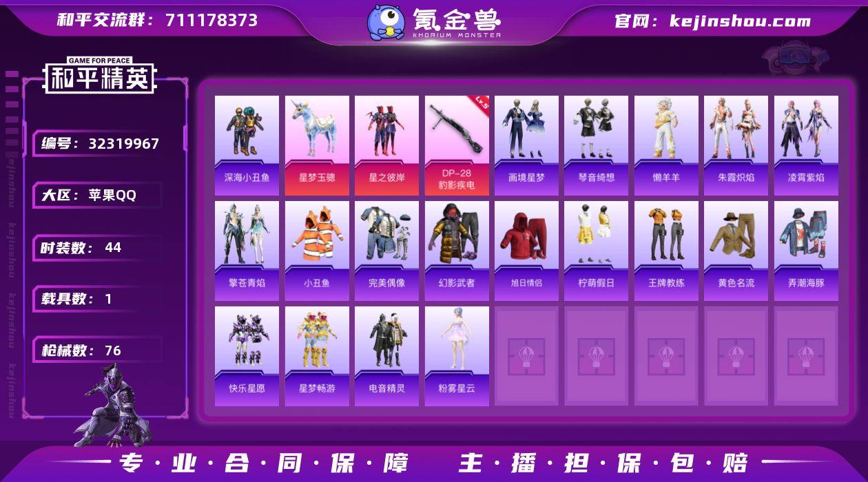 【店主推荐捡漏号!可直接换绑】苹果 手Q-1粉装-2特效枪-1载具-2粉色飞行器-20946热力值-3王牌印记-44套装-76枪皮 【热门品类】:套装-深海小丑鱼,套装-小丑鱼 【粉色套装】:粉装-星之彼岸 【粉色枪皮等级】:AKS-74U-森灵之息(五级),DP-28-豹影疾电(五级) 【粉色载具】:星梦玉骢 【粉色枪皮】:AKS-74U-森灵之息,DP-28-豹影疾电 【粉色飞行器】:炫彩糖果飞行器,极意拳锋飞行器 【粉色降落伞】:绝对恒星降落伞,星之彼岸降落伞,星梦奇缘降落伞,喜羊羊与灰太狼降落伞,炫彩糖果降落伞,罪夜之冕降落伞 【稀有套装】:套装-雪国风尚,套装-炫彩糖果,套装-马上有钱,套装-朱霞炽焰,套装-凌霄紫焰,套装-擎苍青焰,玩偶服-懒羊羊,套装-画境星梦,套装-琴音绮想,套装-红釉青花,角色-唐三 【稀有枪皮】:AUG-冰晶雪宝,AKM-星之彼岸,AKM-缤纷海域,SCAR-L-炫彩节奏,SCAR-L-玉兔迎春,M416-蓝色火焰,M762-天降萌叽,M762-登顶巅峰,AC-VAL-天降萌叽,ACE32-画境星梦,ARX-凌霄紫焰,汤姆逊-灵猫魔法师,汤姆逊-像素花束,MP5K-画境星梦,JS9-凌霄紫焰,SKS-迅猛狂鲨,VSS-星之彼岸,Mini14-穿刺龙虾,Mini14-绯穹魔姬,M1加兰德-画境星梦,S686-奇异狩猎者,DBS-幻...