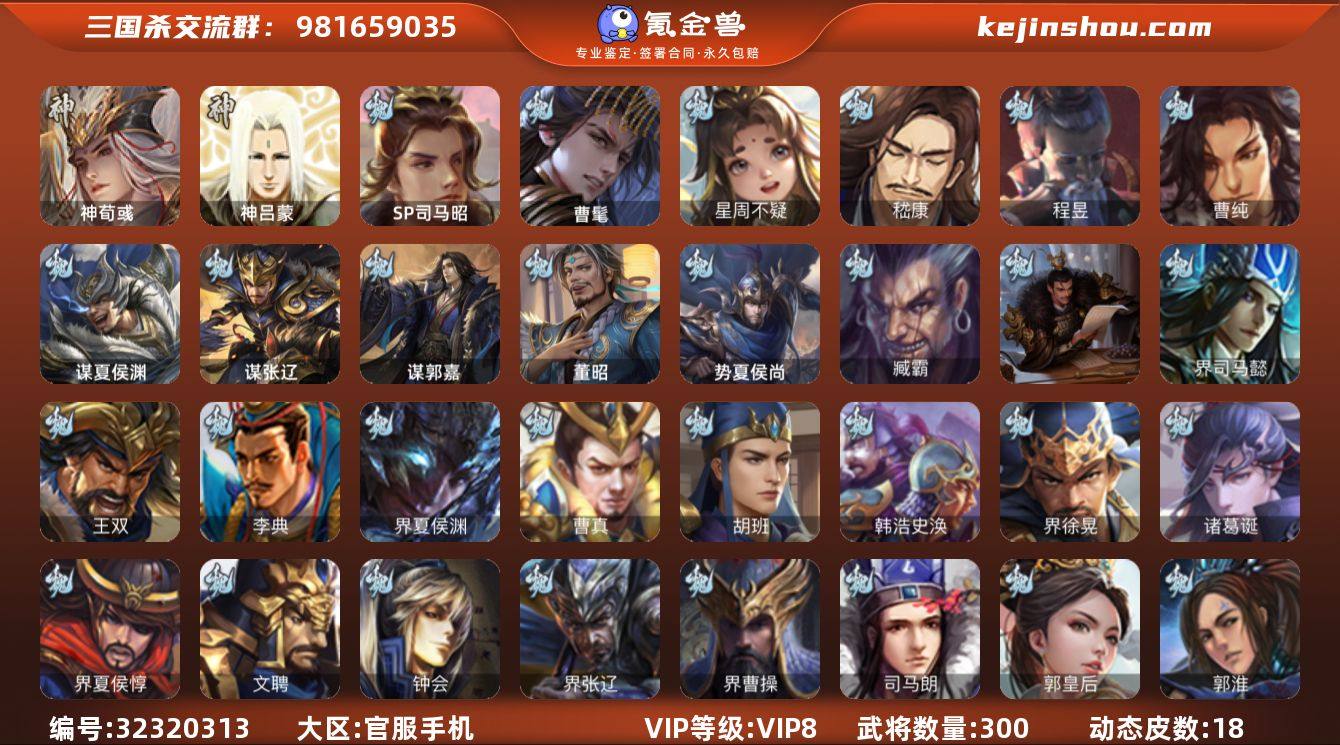 【14789557】官阶:骠骑将军;VIP等级:VIP8;史诗武将数量:19;动态皮肤数量:18;武将总数:300;史诗宝珠数量:0;将魂数量:816;神将:1;魏国史诗武将:12;蜀国史诗武将:5;吴国史诗武将:3;群史诗武将:4