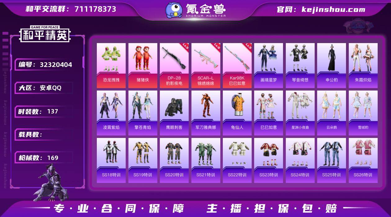 安卓 手Q-2粉装-6特效枪-0载具-0粉色飞行器-28461热力值-6王牌印记-67套装-109枪皮 【热门品类】:套装-深海小丑鱼,套装-龟仙人 【粉色套装】:角色-复仇流浪者,粉装-星穹咏叹调 【粉色枪皮等级】:AKS-74U-星穹咏叹调(七级),AKS-74U-森灵之息(五级),Kar98K-巳巳如意(五级),DP-28-豹影疾电(五级) 【粉色枪皮】:ACE32-萌骑漫游,AKS-74U-星穹咏叹调,AKS-74U-森灵之息,Kar98K-巳巳如意,Mk14-福马献瑞,DP-28-豹影疾电 【粉色降落伞】:星穹咏叹调降落伞,炫彩糖果降落伞 【稀有套装】:套装-龟仙人,套装-巳巳如意,角色-都市丽猫,套装-紫幽梦,套装-蓝冰羽,套装-星影赞美诗,套装-星渊小夜曲,套装-朱霞炽焰,套装-凌霄紫焰,套装-画境星梦,套装-琴音绮想,套装-雨过天青,套装-红釉青花 【稀有枪皮】:AKM-破晓战魂,M16A4-幻世战舞者,SCAR-L-玉兔迎春,M416-红色方程式,M416-蓝色火焰,AUG-天降萌叽,AUG-耀粉歌者,M762-天降萌叽,G36C-星穹咏叹调,AC-VAL-天降萌叽,蜜獾-天降萌叽,ACE32-画境星梦,ARX-凌霄紫焰,UZI-啾咪啾咪,UZI-天降萌叽,汤姆逊-幻星舰长,MP5K-画境星梦,JS9-凌霄紫焰,P90-巳巳如意,Kar98K-星穹咏叹调,M24-幻彩电音,VSS-彩虹符号,SLR-彩虹符号,AMR-喜羊羊与灰太狼,M1加兰德-画境星梦,S686-彩虹符号,S686-巳巳如意,S1897-炫彩节奏,S12K-玩趣呆呆,S12K-破晓战魂,S12K-幻世战舞者,DBS-彩虹符号,DBS-幻彩电音,AA12-G-画境星梦,M249-破晓战魂,M249-糯团青竹,DP-28-彩虹符号,MG3-幻世战舞者,MG-36-凌霄紫焰,P92-凌霄紫焰,短管霰弹-星穹咏叹调,蝎式手枪-千金淑猫,TMP-9-雪月幻音,爆炸猎弓-喜羊羊与灰太狼,平底锅-凌霄紫焰,平底锅-画境星梦,破片手榴弹-巳巳如意 【其他套装】:套装-SS20特训,套装-SS21特训,套装-SS22特训,套装-SS23特训,套装-S...