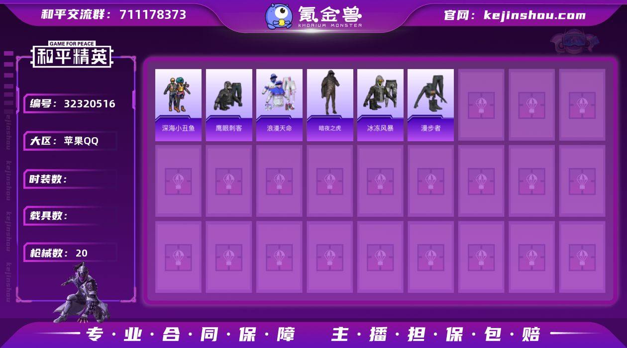 DSH2372【身法号3特 0粉深海小丑鱼,暗影哥特】苹果手Q-3特效枪-20套装-20枪皮-1王牌印记-卓越王牌6星-5831热力值【3特效枪】ACE32-萌骑漫游[3级],AKS-74U-森灵之息[4级],Mk14-福马献瑞[5级]【3稀有】深海小丑鱼,浪漫天命,暗影哥特【1飞行器】马上有福飞行器【34其它衣服和枪皮】角色-魂电,福马献瑞,冰冻风暴,街头潮人,鹤鸣,鹰眼刺客,玲珑侠影,漫步者,SS37特训,狙击之神,军械专家,红釉青花,马上来财,老实芭蕉,暗夜之虎,雨过天青,角色-幸运青,SPAS-12-福马献瑞,GROZA-福马献瑞,蜜獾-启元战纹,沙漠之鹰-雨过天青,AMR-雨过天青,M24-影袭,M16A4-雨过天青,AUG-耀粉歌者,AKM-龙的传人,UZI-影袭,汤姆逊-像素花束,GROZA-影袭,AA12-G-雨过天青,PKM-雨过天青,燃烧瓶-福马献瑞,蜜獾-天降萌叽,SLR-乌木金纹