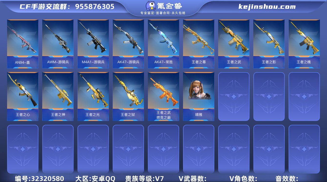 安卓Q\贵族7\晴雅\王者之魄-冠军珍藏\王者之武-燃竞之巅\王者之光\AWM-游骑兵\M4A1-游骑兵\AN94-盖\\AK47-游骑兵\王者之心\王者之影\王者之尊\AK47-常胜\\王者之神\王者之狱-冰霜奇迹\王者之魂-HeartShot\黄金COP357\王者之烈\王者之霆\KSG-孟获\详请见图\