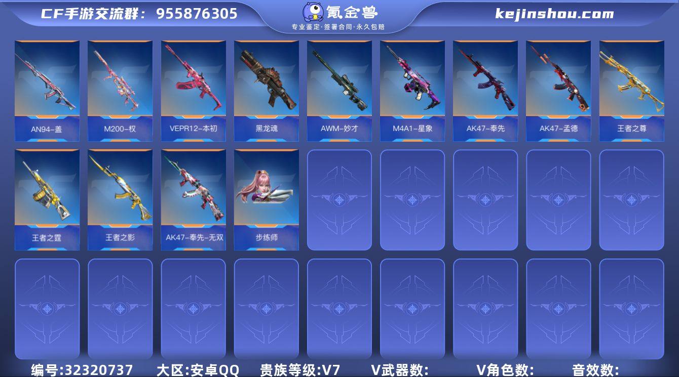 7英雄角色数-217英雄武器数 【王者系列】:王者之翼,王者之击,王者之戮,王者之影,王者之心,王者之神,王者之锋,王者之魂,王者之啸 【热门武器】:81式-光明之神,M4A1-武圣,AK47-游骑兵,M4A1-游骑兵,81式-阿波罗,COP 357-绚樱 【角色】:零,葵,关小雨*2,岚兮儿,职场灵狐-赛事经理,炽天使-X 【英雄武器】:AK47-无影,AK47-火麒麟,AK47-黑武士觉醒,AK47-沙漠领主*2,AK47-游骑兵,AK47-冰魂,AK47-樱斗士-二觉,AK47-变色龙,AK47-猩红传说,AK47-沙漠郡主-一觉,AK47-沙漠郡主-超觉,AK47-幸运日,AK47-雷麒麟,AK47-血武士,AK47-木兰*2,M4A1-雷神,M4A1-黑骑士,M4A1-黑龙,M4A1-死神,M4A1-玫瑰精灵*2,M4A1-游骑兵,M4A1-君威GS*2,M4A1-武圣,M4A1-龙血,M4A1-海骑士,M4A1-心动次元,M4A1-运输船,SCAR-幽暗骑士觉醒,SCAR-探星者,SCAR-印刷术,AN94-超新星,剑齿虎-炫彩,AN94-四凶觉醒,AUG-机械纪元,9A91-天神,9A91-魔蜥觉醒,M14EBR-拂影,M16-恶魔,QBZ03-湮灭*2,QBZ03-死神*2,81式-光明之神,QBZ191-封神榜,AWM-裁决,AWM-天使,巴雷特-毁灭*5,巴雷特-极光*3,巴雷特-枪娘,巴雷特-冬灭觉醒,M200-心动次元觉醒,98K-黑骑士,RPK-赤炎盘龙,加特林-堡垒*2,刘易斯-血月,QBB95-极光,MK5-机械纪元*2,汤姆逊-烈龙*4,双持斯泰尔-天使,QCW05-死神,QCW05-变形金刚·大黄蜂,CZS2-心动次元,PP19野牛-造纸术,地狱火,地狱烈炎,KSG-火力竞放,USP-神罚*5,沙鹰-修罗*5,沙鹰-火麒麟,沙鹰-天神,沙鹰-波塞冬,沙鹰-修罗-铁骑,沙鹰-超新星,左轮-黑武士觉醒,蟒蛇-火力竞放,改装GLOCK-木兰,GLOCK18-武圣,QSZ92-华夏传说,双管猎枪-黑骑士,柯尔特-伏刹山海觉醒,CZ75-龙映钟山觉醒,激光短刃-黑骑士,墨刃-幻神,女皇利刃-铁胆虎魄,炽芒蝶刃,清刚-觉醒,龙啸,神罚战斧...