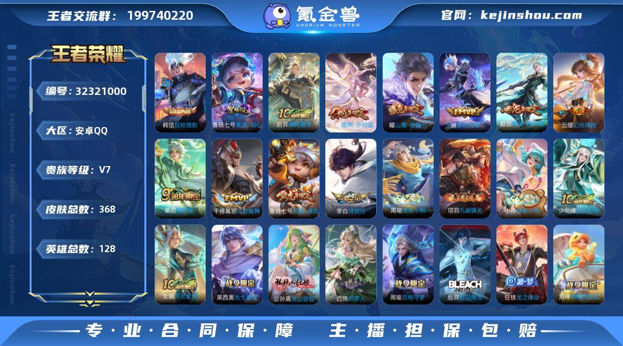 安卓Q-V8-至尊星耀I段位-126英雄-337皮肤-1典藏皮肤-28传说-110史诗 【英雄全皮】:刘禅全皮,敖隐全皮,空空儿全皮 【荣耀典藏】:夏侯惇无限飓风号 【传说皮肤】:云缨神骥越千峰,干将莫邪千山共赴,公孙离记忆之芯,干将莫邪画中仙,李信山海炽霜斩,吕布怒海麟威,不知火舞绯月行,百里守约碎云,马超无双飞将,女娲补天,孙策末日机甲,孙尚香异界灵契,曜李逍遥 ,兰陵王默契交锋,铠绛天战甲,镜炽阳神光,虞姬启明星使,孙悟空零号赤焰,关羽武圣,曜云鹰飞将,李信一念神魔,张良黄金白羊座,干将莫邪久胜战神,花木兰冠军飞将,后羿黄金射手座,貂蝉仲夏夜之梦,宫本武藏地狱之眼,孙悟空地狱火 【限定皮肤】:姜子牙天穹之誓,狄仁杰阴阳师,廉颇寅虎御盾,赵云皇家上将,赵云引擎之心,墨子神迹守卫,嬴政优雅恋人,孙尚香异界灵契,庄周高山流水,钟无艳超时空战士,扁鹊奇幻香踪,白起夜都怪侠,芈月幻夜卜梦,元歌云间偶戏,元歌无心,甄姬游园惊梦,甄姬落雪兰心,马可波罗山海玄木吟,狄仁杰魔术师,狄仁杰万华元夜,达摩沙漠行僧,项羽海滩派对,老夫子航海奇遇记,关羽武圣,关羽百相守梦,程咬金演武夺筹,韩信傲雪梅枪,王昭君午后时光,兰陵王默契交锋...