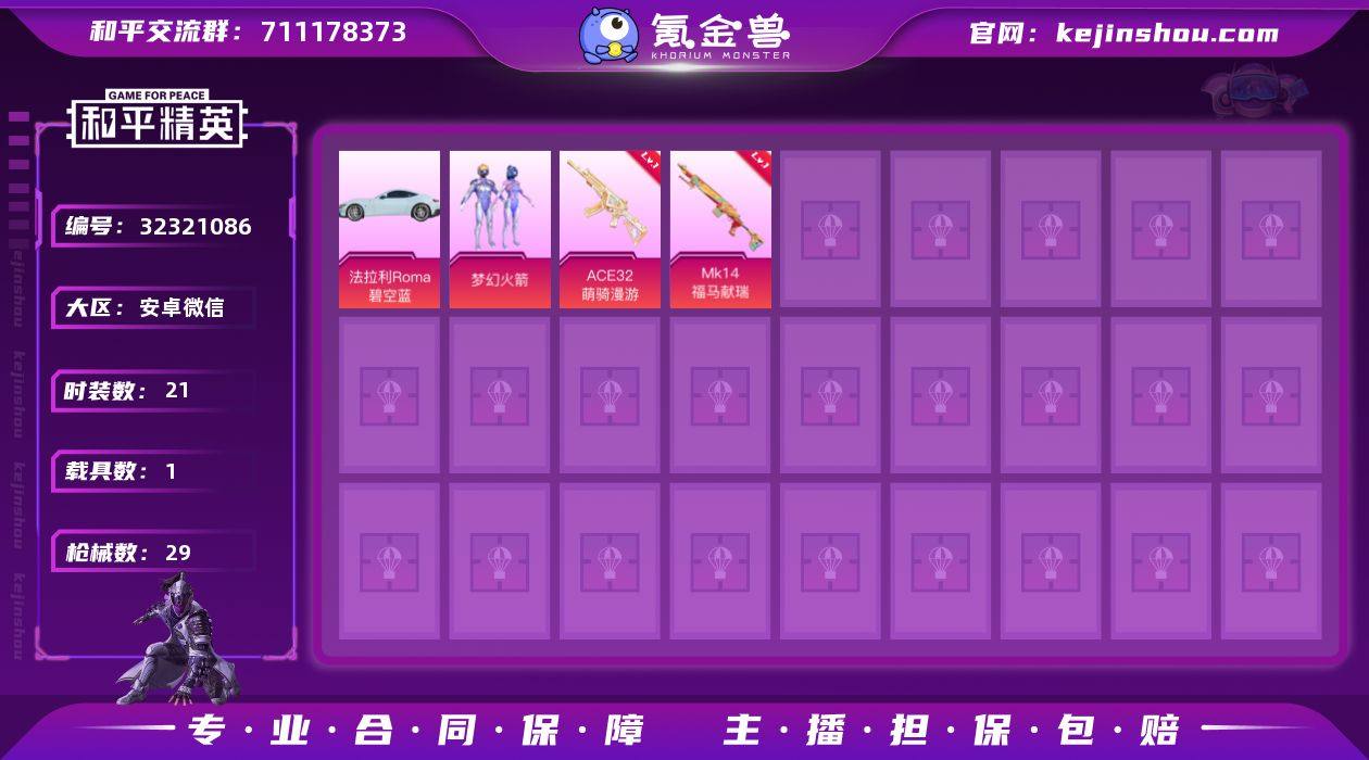 安卓 手Q-3粉装-7特效枪-0载具-2粉色飞行器-52718热力值-4王牌印记-147套装-191枪皮 【热门品类】:套装-都市猎人,套装-暗夜行者,套装-粉红小猪,角色-Mark.06 【粉色套装】:粉装-幻影战神,粉装-闲梦青缨,粉装-金丰海韵 【粉色枪皮等级】:SCAR-L-锦绣绵绵(五级),AKS-74U-森灵之息(五级),Kar98K-巳巳如意(五级),Mk14-福马献瑞(五级),MK20-H-海螺星光(四级),M249-猪猪侠(六级),DP-28-豹影疾电(五级) 【粉色枪皮】:SCAR-L-锦绣绵绵,AKS-74U-森灵之息,Kar98K-巳巳如意,Mk14-福马献瑞,MK20-H-海螺星光,M249-猪猪侠,DP-28-豹影疾电 【粉色飞行器】:变形金刚飞行器,拂晓神骑飞行器 【粉色降落伞】:幻影战神降落伞,海螺星光降落伞,拂晓神骑降落伞,圣堂之誓降落伞,猪猪侠降落伞,金丰海韵降落伞,未来领航者降落伞,幻彩电音降落伞 【稀有套装】:套装-巳巳如意,套装-雪国风尚,套装-雏菊兔兔,套装-萝兰蝴蝶,套装-小熊娃娃,套装-糖糖葫芦,套装-青团波波,套装-燕燕于飞,套装-鱼渊荷华,玩偶服-小狗蛇点点,套装-白辉玉蕊,角色-绯色魅影,套装-书海巡游,套装-画境星梦,套装-琴音绮想 【稀有枪皮】:AKM-彩虹符号,AKM-影袭,AKM-破晓战魂,AKM-霓虹街区,AKM-龙的传人,M16A4-幻世战舞者,SCAR-L-夜灯,SCAR-L-红色方程式,SCAR-L-小狗蛇点点,M416-暗夜行者,M416-糯团青竹,M416-红色方程式,M416-绯红前夜,M416-蓝色火焰,GROZA-异彩先驱,GROZA-彩虹符号,GROZA-影袭,GROZA-田园牧歌,GROZA-蓝莓炮弹,AUG-天降萌叽,AUG-幻影战神,AUG-海螺星光,AUG-耀粉歌者,QBZ-彩虹符号,M762-天降萌叽,M762-绯红前夜,Mk47-洛神天依,AC-VAL-天降萌叽,AC-VAL-快闪甜心,蜜獾-天降萌叽,ACE32-画境星梦,UZI-啾咪啾咪,UZI-幻影战神,UZI-炫彩节奏,UZI-红色方程式,UZI-金玉无双,UMP45-...