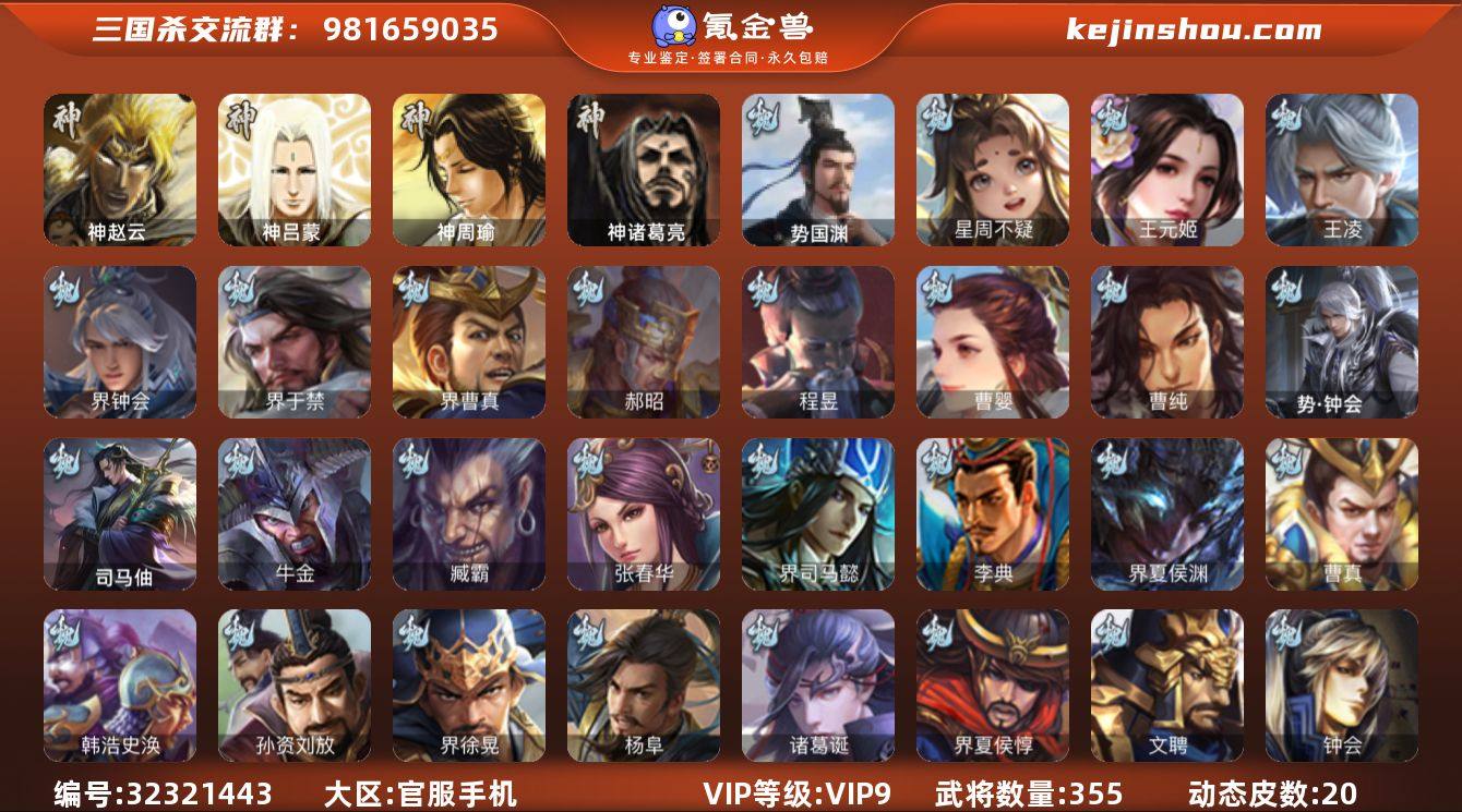 【14789558】官阶:大将军;VIP等级:VIP9;史诗武将数量:36;动态皮肤数量:20;武将总数:355;史诗宝珠数量:44;将魂数量:5455;神将:2;魏国史诗武将:8;蜀国史诗武将:7;吴国史诗武将:6;群史诗武将:10