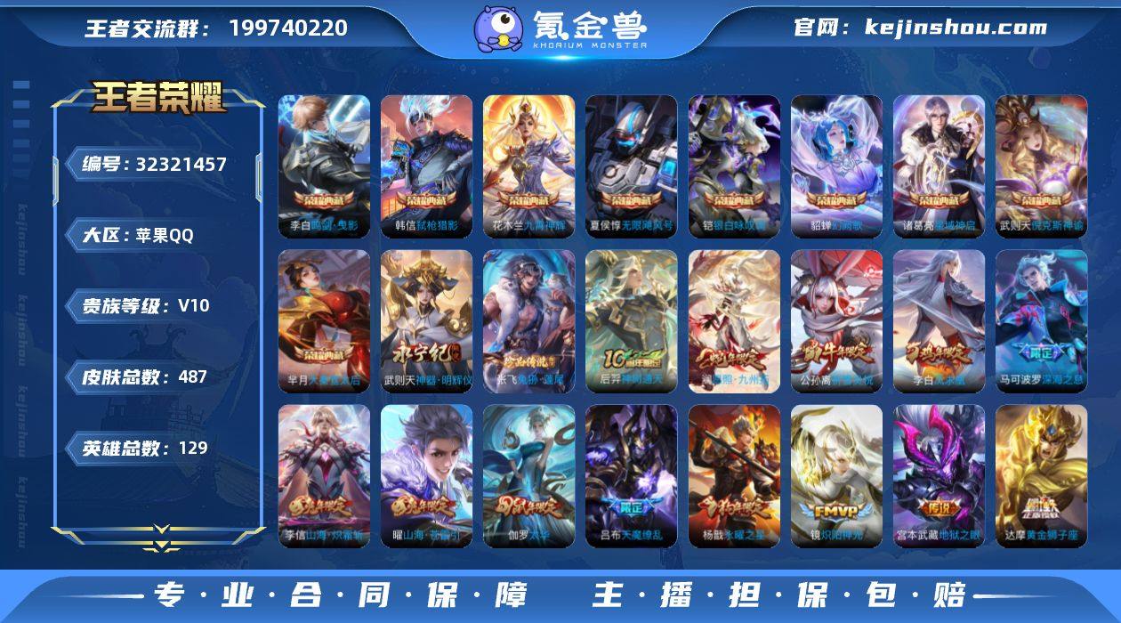 实名: 可修改 贵族等级: V10 英雄数: 128 皮肤数: 527 荣耀水晶: 星空梦想,银白咏叹调,神鉴启示录,最初的交响 无双皮: 真我赫兹(瑶),青丘·九尾,韩信群星魔术团,离恨烟,雪境奇遇-甄姬,器灵·螭龙剑 珍品传说: 时之奇旅-孙策,器灵·落星盏,兔狲·蓬尾,酷洛米之心,大耳狗之梦 传说皮: 黄金狮子座,黄金射手座,云鹰飞将,绛天战甲,黄金白羊座,久胜战神,炽阳神光,一念神魔,云霓雀翎,末日机甲-孙尚香,地狱火,仲夏夜之梦,音你心动-小乔,零号·赤焰,地狱之眼,飞鸢探春,音你心动-周瑜,胖达荣荣,李逍遥,乞巧织情,时之恋人-刘备,淬星耀世,超时空战士-狄仁杰,末日机甲-孙策,无双飞将,音你闪耀,碎云,山海·琳琅生,燃星之曲,画中仙,浮生妄,记忆之芯,百相守梦(张飞),追逃游戏(亚瑟),鹤羽星尊,灼幽烈阳,妄想实况,妄想奇谈,鹤归松栖(云缨),惊梅引,鲁班七号-时之奇旅,霜月吟,澜逐花归海,艾琳觅芳踪,琥珀纪元铠,乘龙·问璇玑,乘龙·铭钟鼎,乘龙·淬吴钩,吕布曦玄引,典韦战鼓燎原,黄金天蝎座,铠冥王哈迪斯,牧神诗旅,启明星使,玄雷天君,幻光神枪,祥瑞亨通,星之鸣奏,续相思,九山相柳,死亡执政官,万灵伏威,神树通天 限定皮: 李小龙,梁祝,御风骁将,引擎之心,龙胆,武圣,烈魂,辉光之辰,白晶晶,天狼溯光者,神威,永曜之星,奇迹圣诞,太华,逐梦之翼,冰霜恋舞曲,凤求凰,青龙志,玄武志,至尊宝,默契交锋-兰陵王,大圣娶亲,霸王别姬-项羽,霸王别姬-虞姬,高山流水,孙行者,猪悟能,女儿国国王,傲雪梅枪,百木心枪,匿光决锋者,唐三藏,五谷丰年,绯月行,诗剑行,降魔,怒海麟威,山海·玄木吟,影龙天霄,夏侯惇霜北刀,陌上桑,愿照·千秋盛,愿照·众生和,愿照·山河定,愿照·岁时盈,愿照·福禄聚,愿照·九州拓