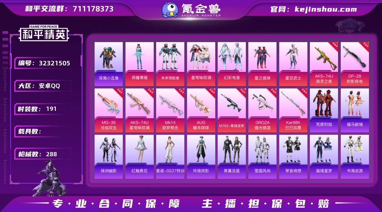 安卓 手Q-5粉装-10特效枪-2载具-1粉色飞行器-73017热力值-11王牌印记-183套装-242枪皮 【热门品类】:粉装-梦幻火箭,套装-浪漫天命,套装-奇异狩猎者,套装-龟仙人,套装-暗影哥特,套装-红红火火,角色-Mark.06,熔岩游骑兵连帽夹克 【粉色套装】:粉装-天使彩虹糖,粉装-梦幻火箭,粉装-齐天大圣,粉装-霓裳武神,角色-冷漠罗丽 【粉色枪皮等级】:AKM-绿萝繁花(五级),SCAR-L-梦幻火箭(四级),M416-五爪金龙(七级),蜜獾-异瞳寒姬(四级),UZI-畅跳缤纷(五级),AKS-74U-森灵之息(五级),Kar98K-巳巳如意(五级),Mk14-福马献瑞(一级),DP-28-豹影疾电(五级) 【粉色载具】:兰博基尼Aventador SVJ(翡翠绿),兰博基尼URUS(明艳黄) 【粉色枪皮】:AKM-绿萝繁花,SCAR-L-梦幻火箭,M416-五爪金龙,蜜獾-异瞳寒姬,UZI-畅跳缤纷,AKS-74U-森灵之息,Kar98K-巳巳如意,Mk14-闲梦青缨,Mk14-福马献瑞,DP-28-豹影疾电 【粉色飞行器】:炫彩糖果飞行器 【粉色降落伞】:梦幻火箭降落伞,王牌四分卫降落伞,齐天大圣降落伞,洛神天依降落伞,天星战神降落伞,幻彩电音降落伞,极意拳锋降落伞,炫彩糖果降落伞,暮色玫影降落伞 【稀有套装】:套装-龟仙人,套装-巳巳如意,套装-雪国风尚,套装-炫彩糖果,角色-临安公主,套装-风舞幻音,套装-书海巡游,套装-画境星梦,套装-琴音绮想 【稀有枪皮】:AUG-冰晶雪宝,AKM-夜灯,AKM-星兔领航员,AKM-玉龙,AKM-生命誓言,AKM-破晓战魂,AKM-萌趣颜团子,AKM-虎虎生威,AKM-霓虹街区,AKM-龙的传人,M16A4-凝视深渊,M16A4-幻世战舞者,M16A4-甜心亚梦,M16A4-魔法学院,SCAR-L-夜灯,SCAR-L-炫彩节奏,SCAR-L-玉兔迎春,SCAR-L-红色方程式,M416-糯团青竹,M416-红色方程式,M416-蓝色火焰,GROZA-彩虹符号,GROZA-影袭,GROZA-懵萌河马,GROZA-田园牧歌,GROZA-暮色玫影...