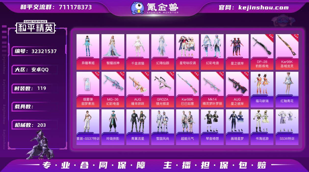 【kyhp993】安卓 手Q-5粉装-8特效枪-1载具-1粉色飞行器-64189热力值-11王牌印记-141套装-199枪皮 【热门品类】:套装-浪漫天命,套装-龟仙人,套装-糯粉咩咩 【粉色套装】:粉装-宝贝奶油派,粉装-海渊国主,粉装-未来歌姬,角色-阿尔茜,角色-羊梦糖心 【粉色枪皮等级】:AKM-梦之光华(七级),M416-风花雪月(七级),ACE32-萌骑漫游(三级),AKS-74U-森灵之息(五级),Kar98K-巳巳如意(五级),Mk14-福马献瑞(五级),AMR-智耀战神(七级),DP-28-豹影疾电(五级) 【粉色载具】:兰博基尼Estoque(银翼灰) 【粉色枪皮】:AKM-梦之光华,M416-风花雪月,ACE32-萌骑漫游,AKS-74U-森灵之息,Kar98K-巳巳如意,Mk14-福马献瑞,AMR-智耀战神,DP-28-豹影疾电 【粉色飞行器】:炫彩糖果飞行器 【粉色降落伞】:甜心宝贝降落伞,星之彼岸降落伞,怪笑疯兔降落伞,绿意幻情降落伞,暗星紫秘降落伞,炙焰牛王降落伞,星夜魔法师降落伞,垂柳戏鸭降落伞,未来歌姬降落伞,拂晓神骑降落伞,萌物绒绒降落伞,幻彩电音降落伞,绯穹魔姬降落伞,炫彩糖果降落伞,镜花水月降落伞 【稀有套装】:套装-龟仙人,套装-小鸟芋圆,套装-雪国风尚,套装-炫彩糖果,套装-马上有钱,套装-霓虹热舞,套装-彩虹兔,套装-云朵鹅,套装-雪绒豹,套装-雨过天青,套装-红釉青花,角色-幽雨猫猫,角色-暖阳柴柴,角色-朱竹清 【稀有枪皮】:AKM-彩虹符号,AKM-星之信仰,AKM-灼热熔岩,AKM-环太平洋,AKM-生命誓言,AKM-破晓战魂,AKM-萌趣颜团子,AKM-霓虹街区,AKM-龙的传人,M16A4-幻世战舞者,M16A4-甜心亚梦,SCAR-L-夜灯,SCAR-L-玉兔迎春,SCAR-L-红色方程式,SCAR-L-黄金龙骨,M416-糯团青竹,M416-绯红前夜,M416-蓝色火焰,GROZA-异彩先驱,GROZA-彩虹符号,GROZA-懵萌河马,GROZA-黑色刀锋,AUG-耀粉歌者,AUG-闲梦青缨,QBZ-飞驰魅影,M76...