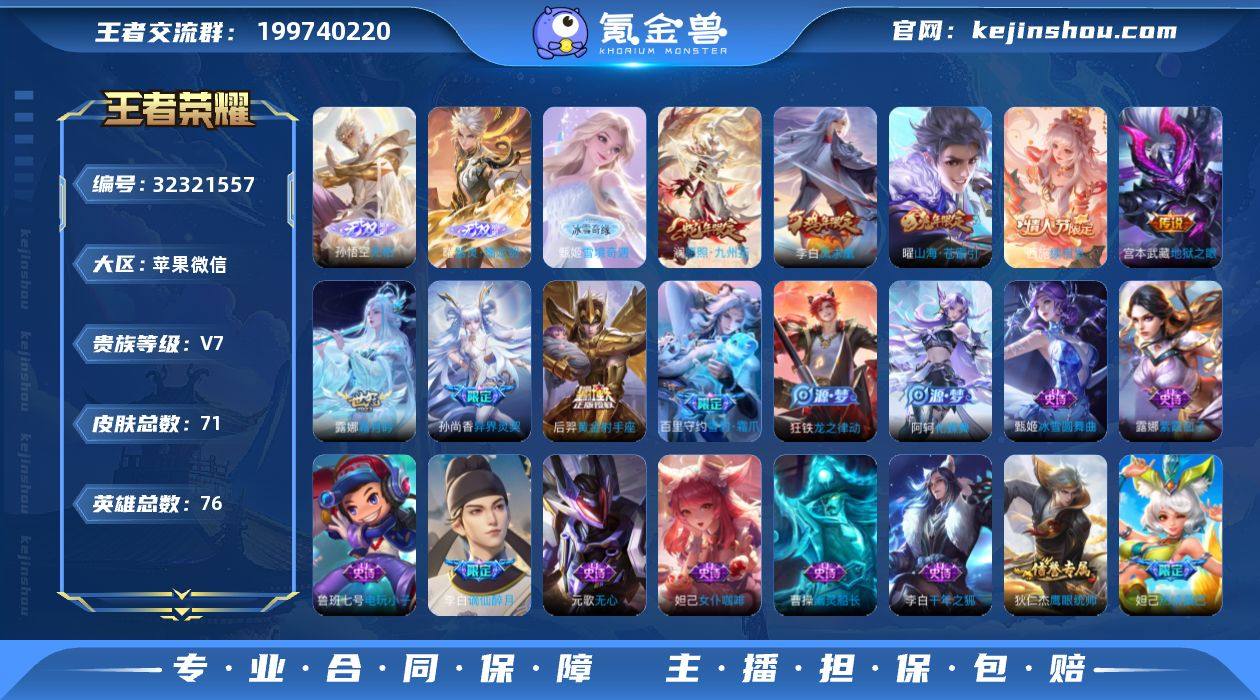 V9 2典藏 2珍品传说 25传说 127英雄 370皮肤 可修改实名 【英雄全皮】蒙恬全皮,狂铁全皮,海诺全皮,戈娅全皮,大禹全皮 【稀有英雄】大司命,夏洛特(夏师傅),金蝉(唐僧),戈娅,赵云,嬴政(始皇帝),韩信(韩跳跳),艾琳,不知火舞,娜可露露(鸟人),橘右京(橘子) 【荣耀水晶】鸣剑·曳影,全息碎影(猴子典藏) 【珍品传说】酷洛米之心,怪盗基德 【传说皮】绛天战甲(鸡嘴战神),淬星耀世,久胜战神,挚爱之约,末日机甲-孙尚香(绿蚂蚱),黄金射手座,炽阳神光,地狱之眼,仲夏夜之梦(大飞蛾),冠军飞将,游龙清影(小青龙),超时空战士-狄仁杰,零号·赤焰,云鹰飞将(小将军),李逍遥,澜逐花归海 【珍宝阁皮】玩趣恶龙,妄想食味,优雅恋人 【赛季/战令皮】夺宝奇兵,朔风刀(s17),剑破天穹(s35),火炮绅士,醍醐杖(s20),迷踪丽影,航海奇遇记,星空之诺,落雪兰心,大漠名商(s28),御銮(s16),超时空战士-钟无艳,烛龙(s10),妖精王(s5),千军破阵(s25),穷奇(s12),蓝屏警告,真爱魔法,星际陆战队-达摩,沙漠行僧(s26),御旌(s15),狮舞东方,圣弓游侠,猎兽之王,星界游侠,赤莲之焰,天穹之誓(s36),云间偶戏,地狱燃心,驯魔猎人,金庭之子(s27),噬灭天穹(s37),驭风魔法,擒涛扼浪(s31),探海日志(s32),疑决卦(s19),吟游魔法,狂想玩偶喵,暗影游猎(游乐娃子),潮玩骑兵,流音漫舞,狰(s8),玲珑珍味,原初探秘者(s21),天穹祈灯(s34),夜都怪侠,潮玩骑士王,古海寻踪(s33),西部大镖客-猪八戒,朔望之晖,海盐诗旅(s30),万华元夜(s22),白昼王子,重明(s11),幻夜卜梦,演武夺筹(s23),炼金王(s6),奇幻香踪,单词大作战,银河之约,云中旅人(s29),神迹守卫-墨子,混沌棋(s18),凯尔特女王(s7),御霄(s14),暖冬·兔眠,神迹守卫-钟馗,顽趣-梦奇,午后时光,驱傩正仪(s24),御狮(s13),电玩高手(电玩铁子),饕餮(s9)