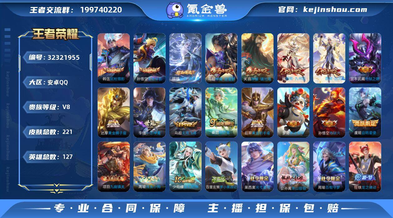 实名: 可修改 性别: 男号 贵族等级: V8 英雄数: 127 皮肤数: 221 荣耀水晶: 全息碎影,弑枪猎影 珍品传说: 器灵·落星盏 传说皮: 黄金狮子座,黄金射手座,一念神魔,地狱火,地狱之眼,胖达荣荣,无双飞将,神骥·逐星野,神骥·镇沧海 限定皮: 李小龙,飞衡,高山流水,五谷丰年,山海·玄木吟,鸣野蒿,逐霄战戟,愿照·山河定,愿照·九州拓 亮点: 【优质装备】:全息碎影(猴子典藏),弑枪猎影(韩信典藏),器灵·落星盏,黄金狮子座,黄金射手座,一念神魔,地狱火,地狱之眼,胖达荣荣,无双飞将,涂山容容