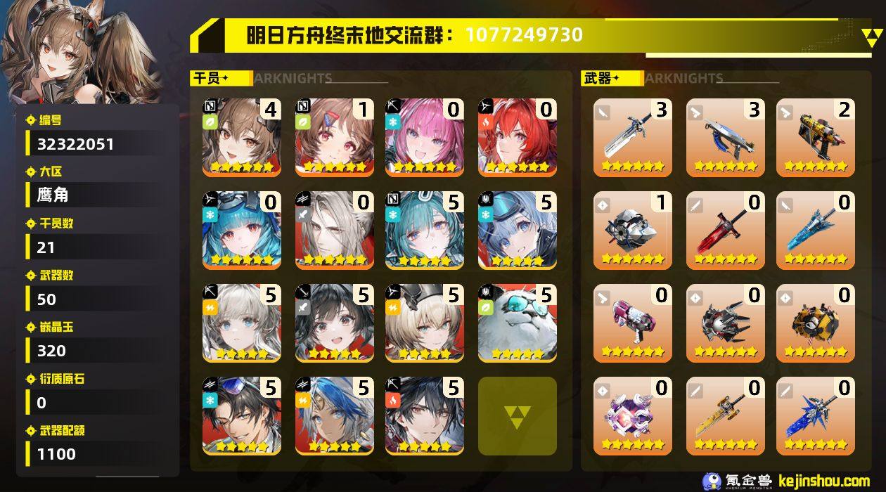 权限等阶:58千员数:21六星干员数量:6武器数:36武库配额:1100嵌晶玉:320 0潜莱万汀,1潜洁尔佩塔,0潜伊冯,4潜洁尔佩塔,0潜别礼,0潜骏卫 0潜熔铸火焰,1潜骑士精神,0潜爆破单元,0潜白夜新星,0潜沧溟星梦,0潜赫拉芬格,0潜宏愿,2潜楔子,0潜使命必达,0潜艺术暴君,0潜热熔切割器,3潜典范,1潜j.e.t,3潜领航者 5潜阿列什,5潜艾维文娜,5潜陈干语,5潜大潘,5潜弧光、5潜狼卫,5潜佩丽卡,5潜赛希5潜昼雪 冰队梦之队小毕业,新地图没探索,常驻活动奖励没做,四号谷地基建毕业,武陵新图基建没点,可以换绑