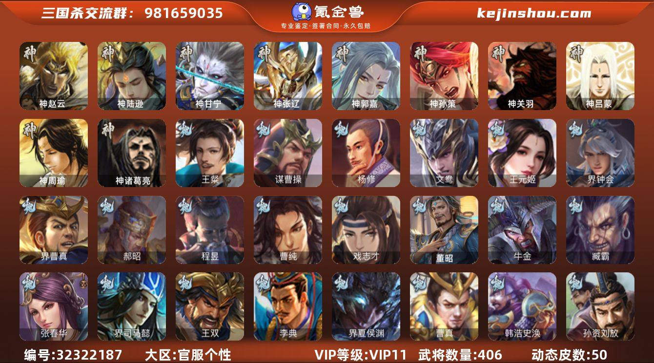 神赵云,神陆逊,神甘宁,神张辽,神郭嘉,神孙策,神诸葛亮,王粲,谋曹操,杨修,王元姬,界钟会,界曹真,郝昭,曹纯,戏志才,程昱,关索,谋刘备,马云騄,谋黄忠,谋夏侯氏,谋赵云,谋马超,诸葛瞻,王平,沙摩柯,谯周,界黄忠,花鬘,董允,谋黄盖,骆统,留赞,界朱然,界徐盛,贺齐,文鸯,裴秀,界沮授,左慈,星黄忠,苏飞,审配,麹义,南华老仙,祢衡,刘焉,沮授,界左慈,界李儒,公孙康,卑弥呼,许攸,兀突骨,神吕蒙,神周瑜,神关羽,SP关羽,SP曹仁,SP蔡文姬,乐进,曹昂,诸葛诞,朱灵,文聘,SP姜维,张春华,钟会,曹冲,郭淮,满宠,界王异,界曹操,界司马懿,界夏侯惇,界张辽,界许褚,界郭嘉,李典,曹真,韩浩史涣,陈群,曹叡,曹休,钟繇,司马朗,王基,李通,郭皇后,孙资刘放,辛宪英,界甄姬,吕虔,鲁芝,蒯越蒯良,界典韦,界荀彧,界徐晃,杜畿,界曹丕,毌丘俭,界邓艾,张恭,贾逵,界曹植,界曹彰,界满宠,界郭淮,卞夫人,华歆,袁涣,王双,崔琰,杨阜,阮慧,曹嵩,谋徐晃,谋于禁,界曹休,牛金,界夏侯渊,臧霸,唐咨,董昭,SP孙尚香,关银屏,夏侯霸,马良,关兴张苞...
