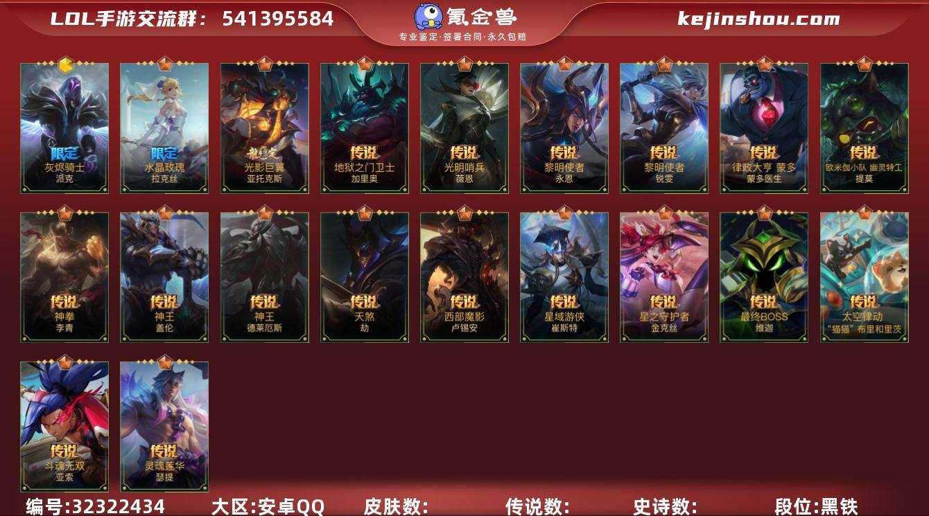 [17593010]3神话 7限定 21传说 65史诗 147皮肤 可二次 可修改实名 【段位】翡翠 【神话皮】夜星流火 金克丝,天命豪侠 瑟提,灰烬骑士派克 【限定皮肤】掠星魔刃,钢铁军团拉克丝,虎痴之拳,水晶玫瑰皇子,水晶玫瑰拉克丝,关羽云长,涂鸦小队艾克 【传说皮】光影巨翼亚托克斯,灵魂莲华腕豪,深海奇域 厄运小姐,地狱之门卫士,西部魔影卢锡安,天煞劫,水晶玫瑰拉克丝,神王诺手,神王盖伦,神拳盲僧,星域游侠卡牌,欧米伽小队 幽灵特工,律政大亨,黎明使者锐雯,光明哨兵薇恩,星之守护者金克丝,斗魂无双亚索,太空律动机器人,最终BOSS维迦,黎明使者永恩,源计划:净化