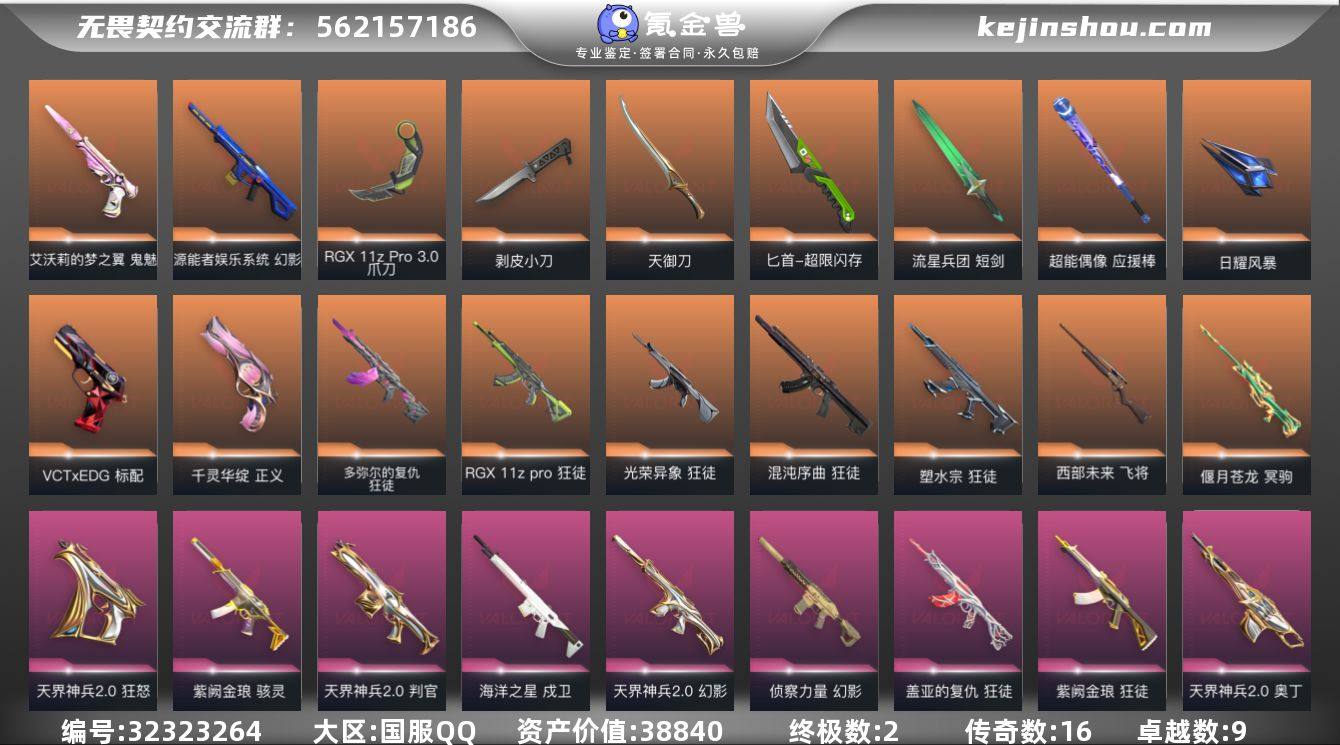 段位: 黄金 套装: 天界神兵//2.0套装,VCT 2026队伍礼包 近战武器皮肤: 剥皮小刀-异形猎人,天御刀-天界神兵//2.0,军刀-流星军团错误,超能偶像 应援棒,爪刀-RGX 11z Pro 3.0,短剑-流星兵团,匕首-超限闪存,日耀风暴 步枪皮肤: 狂徒-紫阙金琅,狂徒-盖亚的复仇,幻影-侦察力量,狂徒-塑水宗,幻影-天界神兵2.0,戍卫-海洋之星,幻影-源能者娱乐系统,狂徒-混沌序曲,狂徒-RGX 11z pro,狂徒-光荣异象,多弥尔的复仇 狂徒 佩枪皮肤: 狂怒-天界神兵2.0,正义-千灵华绽,标配-VCTxEDG,鬼魅-艾沃莉的梦之翼 狙击枪皮肤: 冥驹-偃月苍龙,飞将-西部未来 冲锋枪皮肤: 骇灵-紫阙金琅 霰弹枪皮肤: 判官-天界神兵2.0 机枪皮肤: 奥丁-天界神兵2.0 亮点: 【优质装备】:天界神兵//2.0套装,冥驹-偃月苍龙,狂徒-塑水宗,幻影-源能者娱乐系统,狂徒-混沌序曲,狂徒-紫阙金琅,狂徒-盖亚的复仇,幻影-侦察力量,幻影-天界神兵2.0,正义-千灵华绽,狂徒-RGX 11z pro,多弥尔的复仇 狂徒,剥皮小刀,奥丁-天界神兵2.0,天御刀,鬼魅-艾沃莉的梦之翼,爪刀-RGX 11z Pro 3.0,匕首-超限闪存,日耀风暴 遗器,骇灵-紫阙金琅,判官-天界神兵2.0,戍卫-海洋之星
