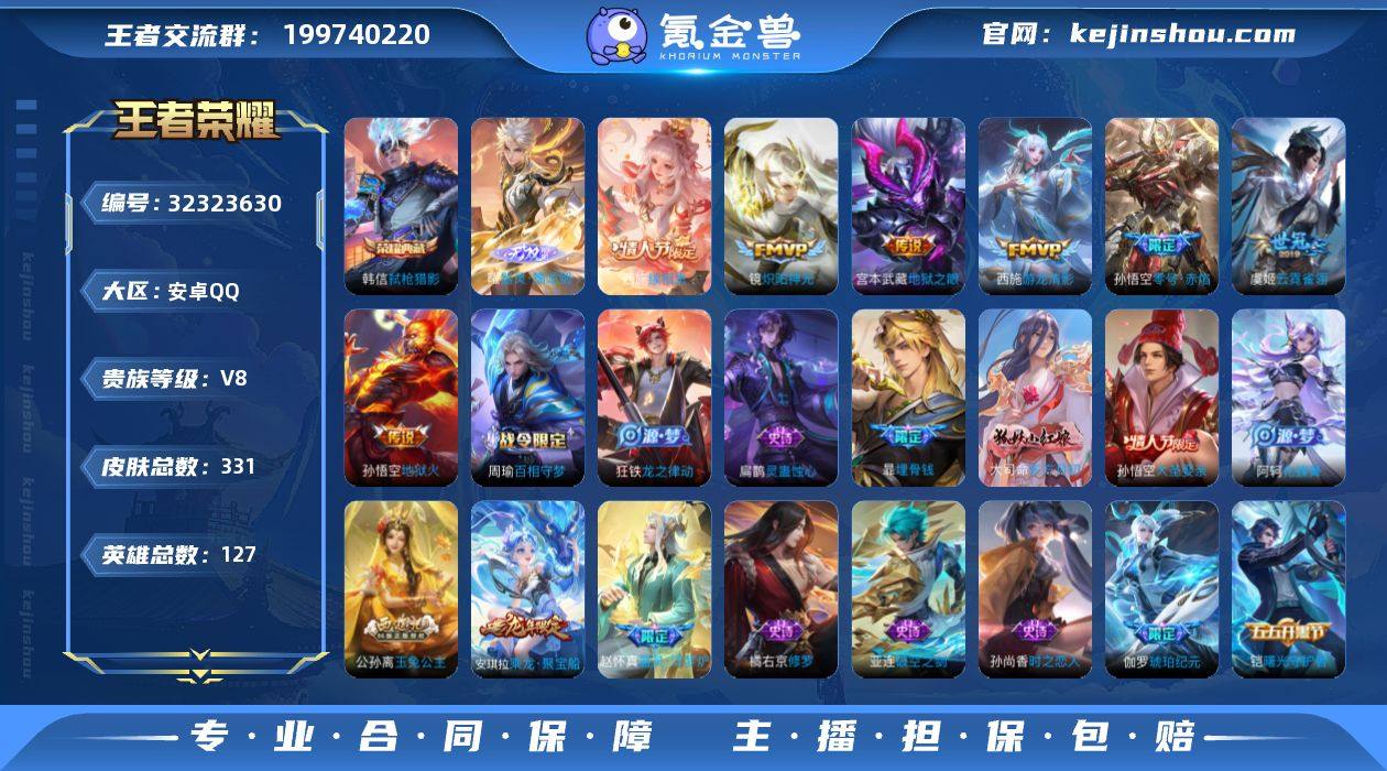 安卓Q-V8-至尊星耀V段位-126英雄-280皮肤-4典藏皮肤-19传说-82史诗 【英雄全皮】:戈娅全皮 【荣耀典藏】:孙尚香杀手不太冷,诸葛亮星域神启,花木兰九霄神辉,虞姬神鉴启示录 【传说皮肤】:后羿神树通天,澜愿照九州拓,云缨幻光神枪,裴擒虎祥瑞亨通,澜电玩雷克斯,安琪拉追逃游戏,虞姬无限倾心,李信山海炽霜斩,李白诗剑行,马超无双飞将,王昭君乞巧织情,铠绛天战甲,镜炽阳神光,虞姬启明星使,刘备时之恋人,张良黄金白羊座,梦奇胖达荣荣,貂蝉仲夏夜之梦,狄仁杰超时空战士 【限定皮肤】:蔡文姬夏日便利店,虞姬夏日便利店,狄仁杰阴阳师,赵云皇家上将,赵云引擎之心,赵云百木心枪,庄周高山流水,钟无艳超时空战士,扁鹊奇幻香踪,白起夜都怪侠,芈月幻夜卜梦,吕布猎兽之王,元歌无心,甄姬落雪兰心,马可波罗山海玄木吟,狄仁杰魔术师,达摩沙漠行僧,项羽海滩派对,老夫子圣诞老人,安琪拉追逃游戏,韩信傲雪梅枪,王昭君午后时光,兰陵王金庭之子,孙悟空孙行者,后羿圣弓游侠,李元芳云中旅人,虞姬启明星使,虞姬无限倾心,钟馗驱傩正仪,杨戬潮玩骑兵,干将莫邪真爱魔法,雅典娜黎明之约,鬼谷子五谷丰年,黄忠火炮绅士,苏烈千军破阵,梦奇顽趣,公...