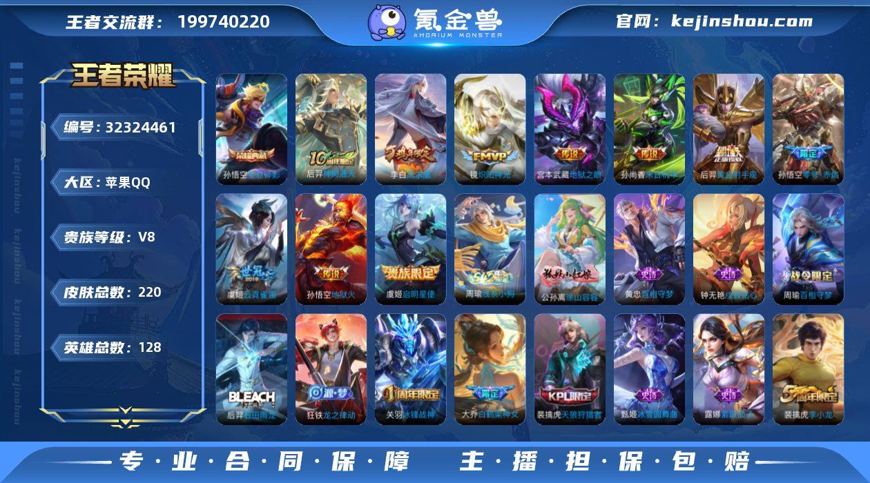 【933812】[17594472]V8 1典藏 10传说 128英雄 220皮肤 可修改实名 男号 【英雄全皮】空空儿全皮,孙权全皮,蚩奼全皮,大禹全皮 【稀有英雄】敖隐(小龙人),大司命,嬴政(始皇帝),韩信(韩跳跳),夏洛特(夏师傅),艾琳,橘右京(橘子),娜可露露(鸟人),不知火舞,赵云,金蝉(唐僧),戈娅 【荣耀水晶】全息碎影(猴子典藏) 【传说皮】神树通天,黄金射手座,零号·赤焰,地狱火,地狱之眼,末日机甲-孙尚香(绿蚂蚱),云霓雀翎,炽阳神光 【珍宝阁皮】蔷薇恋人 【赛季/战令皮】海盐诗旅(s30),擒涛扼浪(s31),暖冬·兔眠,蜃楼王(s4),妖精王(s5),炼金王(s6),凯尔特女王(s7),狰(s8),饕餮(s9),烛龙(s10),穷奇(s12),御狮(s13),御霄(s14),御銮(s16),朔风刀(s17),混沌棋(s18),疑决卦(s19),原初探秘者(s21),万华元夜(s22),驱傩正仪(s24),千军破阵(s25),神迹守卫-钟馗,狮舞东方,赤莲之焰,驯魔猎人,火炮绅士,沙漠行僧(s26),幻夜卜梦,金庭之子(s27),大漠名商(s28),云中旅人(s29) 【史诗皮】线条小狗-周瑜,涂山容容,百相守梦-周瑜,龙之律动,石田雨龙,戍鼓铭心,百相守梦-黄忠,紫霞仙子,白龙吟,黄金分割率,冰冠公主,青蛇,偶像歌手,乱世虎臣,女仆咖啡,摇滚巨星,水果甜心,天才门将,星夜王子,心灵骇客,功夫厨神,德古拉伯...