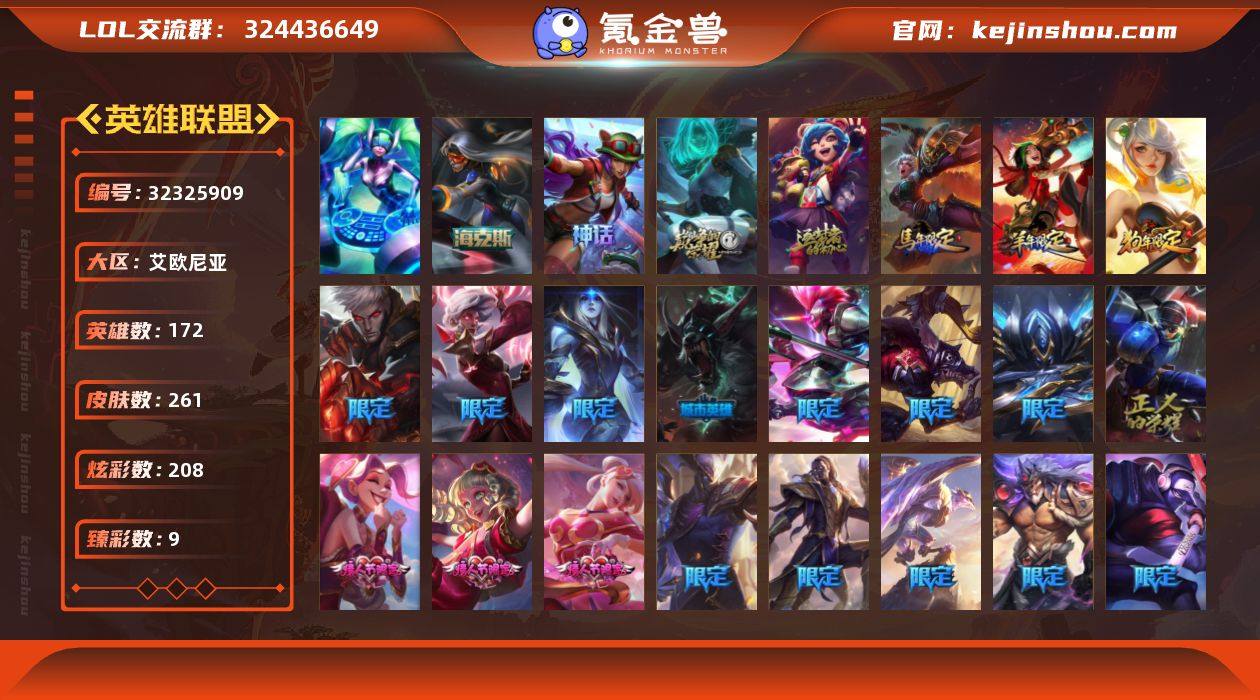 【LD5225】172英雄/261皮肤/1终极/5神话/40限定/9臻彩/208炫彩/35传说/62史诗/未定级/10周年 安妮/源代码 乐芙兰/十五周年纪念 希维尔/10周年庆典 凤凰/海克斯 希维尔/爱情之歌/无畏骑士 瑟庄妮 赤子初心/冠军掠夺者 卡兹克 凯旋圣装/冠军之隐 劫 凯旋圣装/玉剑传说 无极 麒麟/咖啡甜心 璐璐 焦糖布丁/霸天巨兽·雪崩 墨菲特/魔女 阿卡丽 虚荣/净雪之月 莫甘娜 冬虹/预知之眼 亚索 不怠/替父从军 花木兰/神龙烈焰 金克丝/春晖神女 拉克丝/甜心宝贝 安妮/甜心宝贝 娑娜/觅心萝莉 金克丝/觅心之翼奎因/幸福女神 乐芙兰/冰雪风暴 希维尔/邪恶圣诞老人 维迦/冬季仙境 发条/魄罗骑士 瑟庄妮/圣诞捣蛋鬼 金克丝/冰雪节 炼金/DJ-娑娜/冠军掠夺者 卡兹克/S2 暗杀星 慎/S2 暗杀星 伊泽瑞尔/S3 SKT T1 劫/S3 SKT T1 李青/S4 SSW 泰隆/S4 SSW 雷恩加尔/S8 IG 卡莎/暗裔英雄 盖伦/胜利之剑 亚托克斯/胜利枪神 卢锡安/胜利凤凰 艾尼维亚/胜利之王 泰达米尔/灵魂收割者 索拉卡/不给糖就捣蛋 艾克/魅惑女巫 厄运小姐/魅惑女巫 奈德丽/魅惑女巫 波比/泳池派对 李青/暗影 沃里克/电玩战魂 赫卡里姆/都铎王朝 图奇/御星魔矢 艾希/征服者 卡尔玛/征服者 韦鲁斯/防暴天使 凯尔/地狱之门卫士 加里奥/...