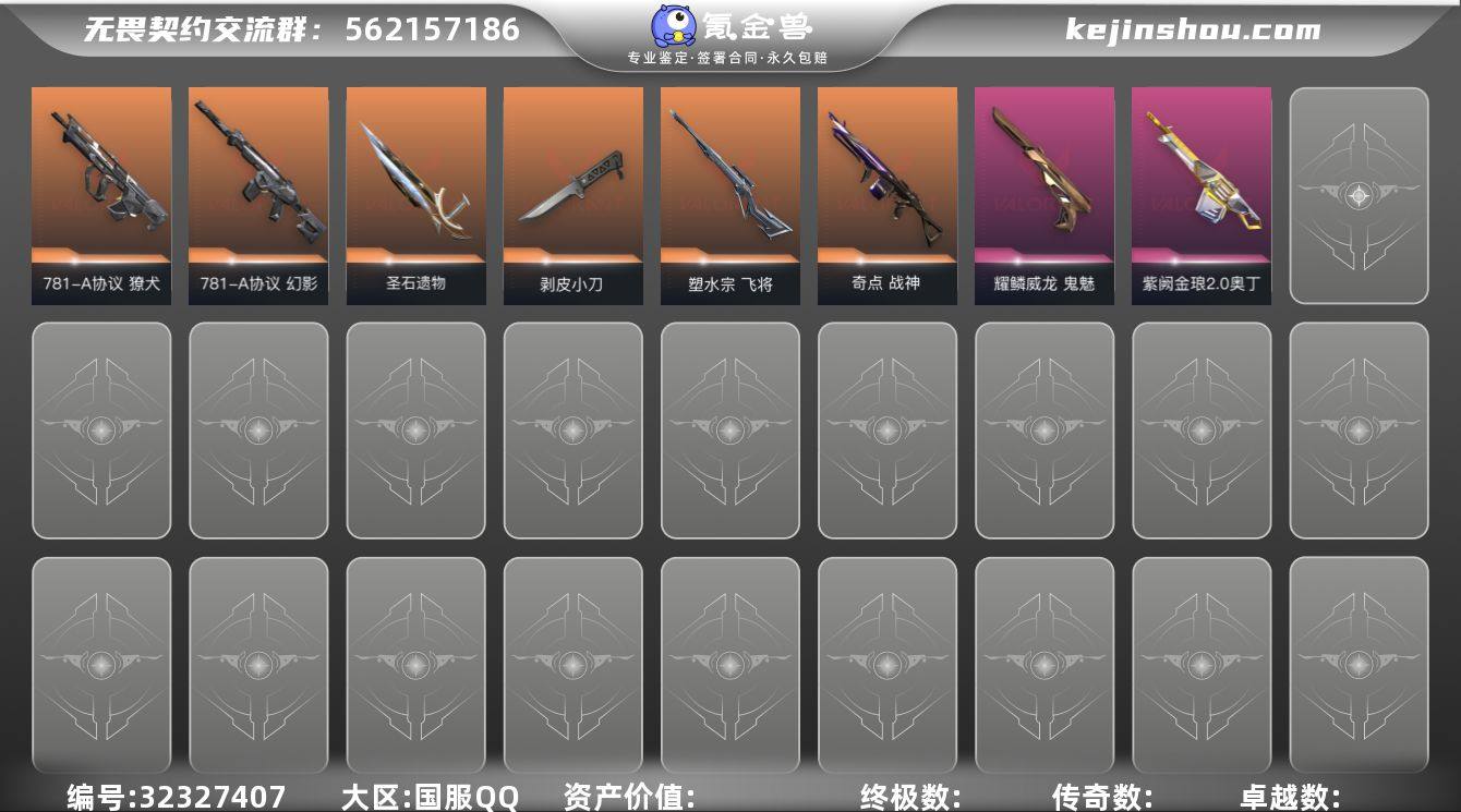 [17596637]15橙皮 2金皮 3紫皮 65皮肤 28英雄 81卡面 760已用源晶 黄金段位 【套装】光明哨兵1.0套装 【近战武器皮肤】匕首-超限闪存,琉璃锻梦剑,圣石遗物,诡秘蛇影,荒土机兵热能刀,剥皮小刀,爪刀-RGX 11z Pro 3.0 【佩枪皮肤】标配-VCT25xAG,正义-光明哨兵,鬼魅-耀鳞威龙 【步枪皮肤】幻影-毁灭骑士,狂徒-光明哨兵,狂徒-耀鳞威龙,幻影-781-A协议,獠犬-781-A协议 【狙击枪皮肤】飞将-塑水宗,冥驹-光明哨兵 【机枪皮肤】战神-奇点,战神-光明哨兵,奥丁-紫阙金琅2.0 【挂饰】V26第一幕纪念币 挂饰,光明哨兵挂饰,终章KO小金人挂饰,VCTxAG挂饰,薰衣草之心挂饰,双城之战小蛋糕挂饰,双城之战魄罗挂饰,神中神挂饰