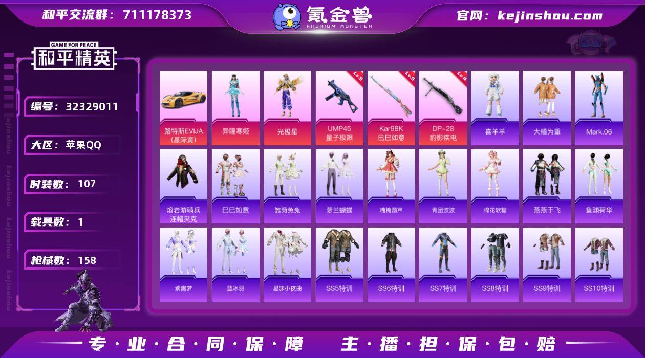 无二次苹果 手Q-2粉装-3特效枪-1载具-0粉色飞行器-45875热力值-5王牌印记-107套装-158枪皮 【热门品类】:角色-Mark.06,熔岩游骑兵连帽夹克 【粉色套装】:角色-光极星,角色-异瞳寒姬 【粉色枪皮等级】:UMP45-量子极限(五级),Kar98K-巳巳如意(五级),DP-28-豹影疾电(四级) 【粉色载具】:路特斯EVIJA(星际黄) 【粉色枪皮】:UMP45-量子极限,Kar98K-巳巳如意,DP-28-豹影疾电 【粉色降落伞】:春暖花开降落伞,炫紫旋律降落伞,繁花小夜曲降落伞,香水柠檬降落伞,齐天大圣降落伞,千面幻镜降落伞,第五大道降落伞,千金淑猫降落伞,临安公主降落伞,鬼刀降落伞,绯穹魔姬降落伞,炫彩糖果降落伞 【稀有套装】:套装-巳巳如意,套装-雏菊兔兔,套装-萝兰蝴蝶,套装-糖糖葫芦,套装-青团波波,套装-棉花软糖,套装-燕燕于飞,套装-鱼渊荷华,套装-紫幽梦,套装-蓝冰羽,套装-星渊小夜曲,玩偶服-喜羊羊 【稀有枪皮】:AKM-夜灯,AKM-灼热熔岩,AKM-生命誓言,AKM-破晓战魂,SCAR-L-夜灯,SCAR-L-炫彩节奏,SCAR-L-玉兔迎春,SCAR-L-生命誓言,M416-夜灯,M416-红色方程式,M416-蓝色火焰,GROZA-影袭,GROZA-治愈之星,GROZA-生命誓言,QBZ-原初圣火,QBZ-神秘黑猫,M762...