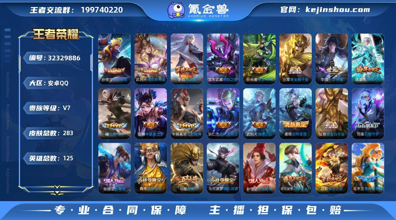 【17】安卓Q-V7-荣耀黄金II段位-125英雄-283皮肤-2典藏皮肤-1典藏英雄-13传说-79史诗 【英雄全皮】:猪八戒全皮 【荣耀典藏】:武则天英雄,孙悟空全息碎影,武则天倪克斯神谕 【传说皮肤】:诸葛亮时雨天司,虞姬启明星使,曜云鹰飞将,李信一念神魔,张良黄金白羊座,干将莫邪久胜战神,达摩黄金狮子座,貂蝉仲夏夜之梦,李白凤求凰,孙尚香末日机甲,宫本武藏地狱之眼,武则天海洋之心,狄仁杰超时空战士 【限定皮肤】:白起狰,狄仁杰阴阳师,虞姬凯尔特女王,赵云皇家上将,赵云引擎之心,嬴政优雅恋人,嬴政白昼王子,鲁班七号狮舞东方,庄周蜃楼王,庄周高山流水,高渐离玩趣恶龙,孙膑妖精王,扁鹊炼金王,扁鹊奇幻香踪,芈月重明,吕布猎兽之王,夏侯惇朔风刀,甄姬游园惊梦,曹操烛龙,典韦穷奇,典韦蓝屏警告,马可波罗暗影游猎,马可波罗山海玄木吟,狄仁杰魔术师,狄仁杰万华元夜,达摩沙漠行僧,项羽海滩派对,老夫子醍醐杖,程咬金演武夺筹,韩信逐梦之影,韩信飞衡,兰陵王金庭之子,花木兰青春决赛季,花木兰瑞麟志,孙悟空美猴王,孙悟空至尊宝,孙悟空大圣娶亲,牛魔御旌,后羿辉光之辰,刘备百相守梦,李元芳银河之约,虞姬启明星使,钟馗神迹守卫,杨玉...