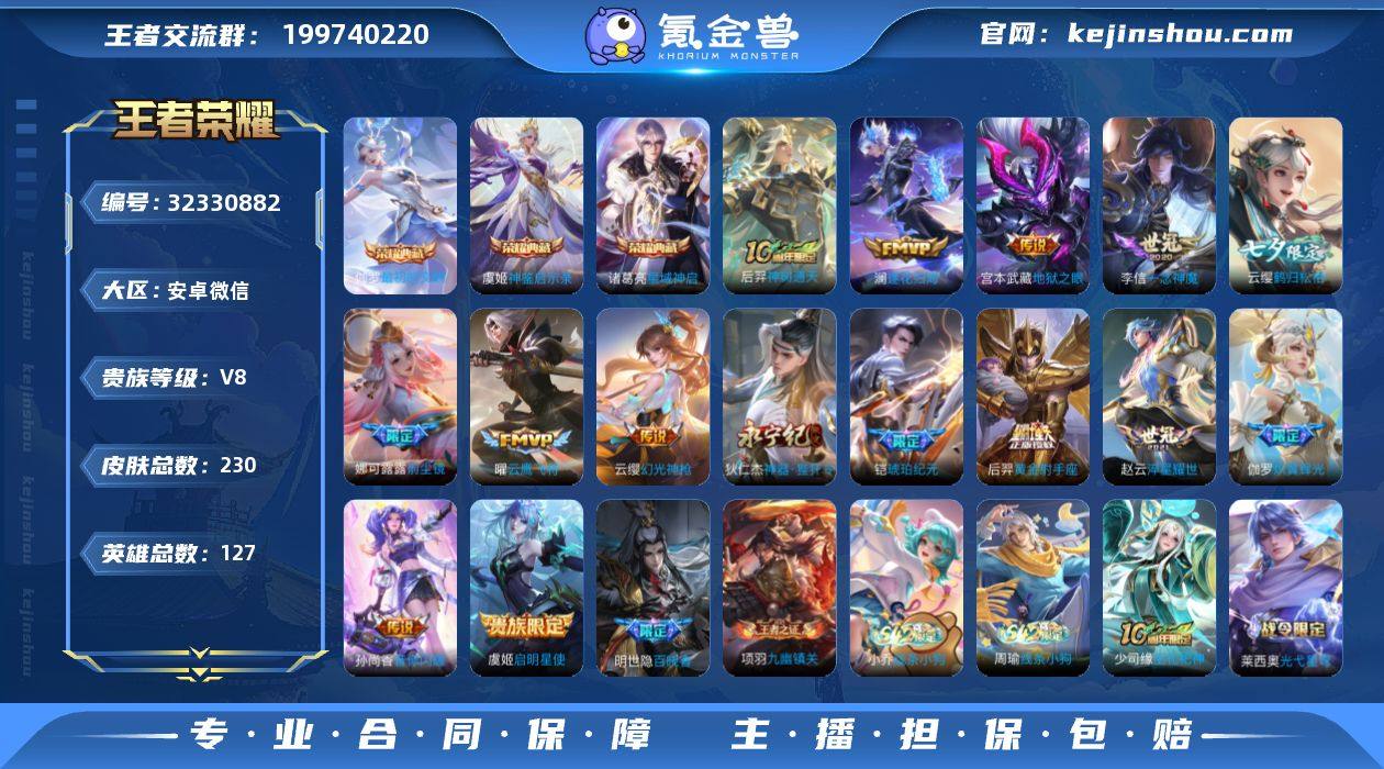 贵族8/皮肤353/典藏3/传说21/史诗98/英雄128/刘禅全皮/孙权全皮/戈娅全皮/空空儿全皮/影全皮/鸣剑·曳影/九霄神辉/弑枪猎影/无相/神树通天/鸣野蒿/夏侯惇霜北刀/典韦战鼓燎原/乘龙·问璇玑/澜逐花归海/山海·琳琅生/淬星耀世/游龙清影/音你心动-小乔/飞鸢探春/时雨天司/炽阳神光/启明星使/一念神魔/时之恋人-刘备/黄金白羊座/久胜战神/黄金射手座/末日机甲-孙尚香/地狱之眼/埋骨钱/蔡文姬夏日便利店/虞姬夏日便利店/天穹之誓(s36)/阴阳师/皇家上将/蔷薇恋人/迷踪丽影/王者之锤/超时空战士-钟无艳/奇幻香踪/猎兽之王/无心/游园惊梦/落雪兰心/魔术师/海滩派对/傲雪梅枪/午后时光/金庭之子(s27)/至尊宝/孙行者/辉光之辰/圣弓游侠/云中旅人(s29)/潮玩骑兵/黎明之约/五谷丰年/原初追遂者/顽趣-梦奇/大漠名商(s28)/李小龙/擒涛扼浪(s31)/电玩高手/纤云弄巧/暖冬·兔眠/玲珑珍味/探海日志(s32)/海盐诗旅(s30)/星界游侠/驭风魔法/女武神/流音漫舞/地狱燃心/江河有灵/古海寻踪(s33)/百解令(蒙犽)/蒙恬荣光圣徽/高渐离燃音魔法/妲己灵卜魔法/鬼谷子天穹祈灯(S34)/龙武盛年/蔬乡物语(鲁班七号)/蔬乡物语(李元芳)/剑破天穹(s35)/程咬金群星魔术团/青焰无极/苍威无极/刘备异域游侠/熔金海岸/噬灭天穹(s37)/谧流熔炉/虚灵犬护/逆浪荇歌/荣光之誓/星界战将/九幽镇关/破空之剑/神迹守卫/百相守梦-百里守约/百相守梦-老夫子/茶境仙/访茗客/鸭鸭历险记-刘禅/鸭鸭历险记-沈梦溪/线条小狗-周瑜/线条小狗-小乔/钟馗锁墨魂/罗小黑战记/石田雨龙/灵蛊蚀心/星界特工/怒海争锋/电玩·爆裂旋风/唤灵魅影/永昼/暗渊魔法/时之奇旅-安琪拉/乐园奇幻夜/天秀·启明/诗语江南/时之恋人-孙尚香/神威/修罗/魅语/青蛇/白蛇/鹰眼统帅/箭羽风息/猫狗日记-大乔/猫狗日记-孙策/节奏热浪/星夜王子/功夫厨神/逐浪之夏/天才门将/舞动绿茵/曙光守护者/特工魅影/心灵...