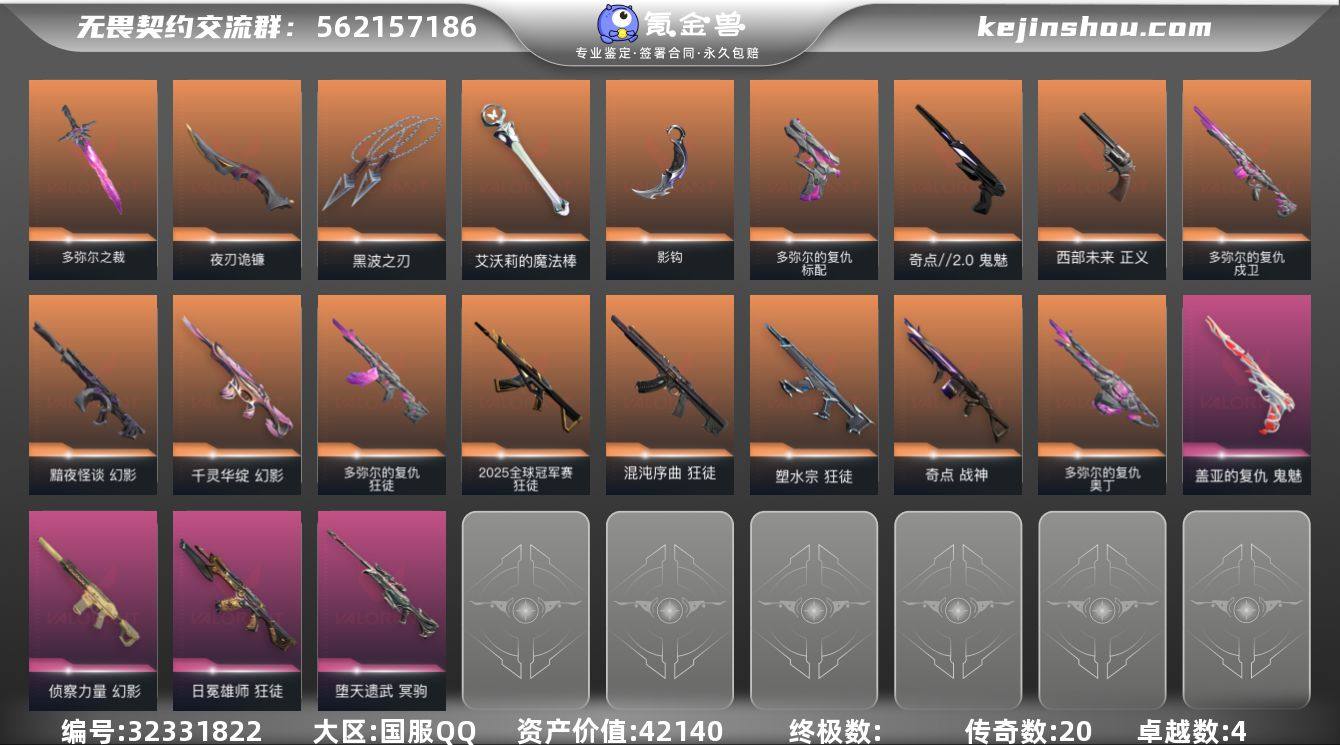 【套装】:2025全球冠军赛套装,无畏契约季前邀请赛套装 【英雄】:幻棱,炼狱,维斯,暮蝶,钛狐,壹决,铁臂,捷风,雷兹,幽影,不死鸟,贤者,猎枭,蝰蛇,零,芮娜,奇乐,尚勃勒,霓虹,斯凯,夜露,星礈,K/O,海神,盖可,黑梦,钢锁 【近战武器】:近战武器-2025全球冠军赛 蝴蝶刀,近战武器-碎心裂刃,近战武器-无畏契约季前邀请赛 悲悯之刃,近战武器-5周年//公测重制版 苍龙之刃,近战武器-神之刃,近战武器-穿花蝴蝶,近战武器-落英飞旋,近战武器-阿特拉斯指挥部 甩棍,近战武器-星际猎兵 短剑 【狂徒】:狂徒-超时空卫队,狂徒-2025全球冠军赛,狂徒-全息波普//2.0,狂徒-塑水宗,狂徒-光荣异象,狂徒-多弥尔的复仇,狂徒-盖亚的复仇,狂徒-离子武器//2.0,狂徒-赤焰铁骥 【幻影】:幻影-毁灭骑士,幻影-混沌序曲//2.0 【戍卫】:戍卫-紫阙金琅 【正义】:正义-奇点,正义-纳米打击 【鬼魅】:鬼魅-天界神兵,鬼魅-诡秘蛇影 【卡面】:终章:激斗汉堡 卡面,进入射程 卡面,《双城之战》拥抱 卡面,精灵大战 卡面,欢迎来到底城 卡面,南瓜盛典 卡面,无畏契约:暮蝶 卡面,修车达人 卡面,正义的化身 卡面,霓帧牛蛙 卡面,梦幻奶茶 卡面,无畏契约GO!第一卷...