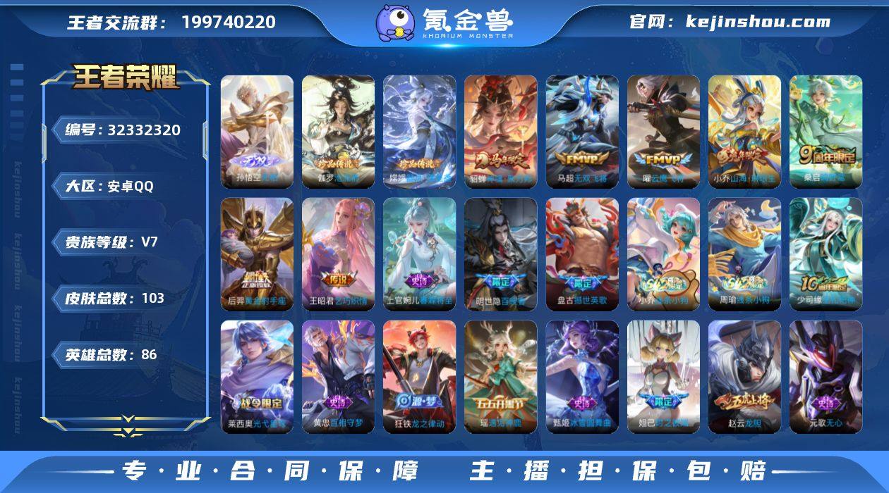 【高性价比·无相·沧流箭·器灵落星盏·黛西宝灵宝·神骥聚万邦·山海琳琅生·乞巧织情·无双飞将·云鹰飞将·黄金射手座·可二次】YXw18609-安卓Q-86英雄-103皮肤-2王者印记-25铭文-贵族积分2w【贵族7】【1无双·2珍品·7传说·7按键】【因赛季更新游戏段付以上号为准!】 【英雄全皮】:影全皮 【无双皮肤】:孙悟空无相 【珍品传说】:伽罗沧流箭,嫦娥器灵落星盏 【传说皮肤】:貂蝉神骥聚万邦,桑启鸣野蒿,小乔山海琳琅生,马超无双飞将,王昭君乞巧织情,曜云鹰飞将,后羿黄金射手座 【限定皮肤】:狄仁杰阴阳师,小乔山海琳琅生,赵云皇家上将,赵云龙胆,妲己热情桑巴,妲己时之彼端,元歌无心,狄仁杰魔术师,项羽海滩派对,米莱狄胡桃异想国,妲己灵卜魔法 【年限皮肤】:小乔山海琳琅生 【赛季限定】:钟馗虚灵犬护,甄姬逆浪荇歌,亚瑟荣光之誓 【战令限定】:米莱狄胡桃异想国,妲己灵卜魔法,孙悟空神迹守卫,莱西奥光弋星穹,明世隐往忆晖光,周瑜线条小狗,小乔线条小狗 【史诗皮肤】:上官婉儿春霖将至,明世隐百晓客,盘古撼世英歌,周瑜线条小狗,小乔线条小狗,少司缘巫礼祀神,莱西奥光弋星穹,黄忠百相守梦,狂铁龙之律动,妲己灵卜魔法,元歌无心,米莱狄胡桃异想国...