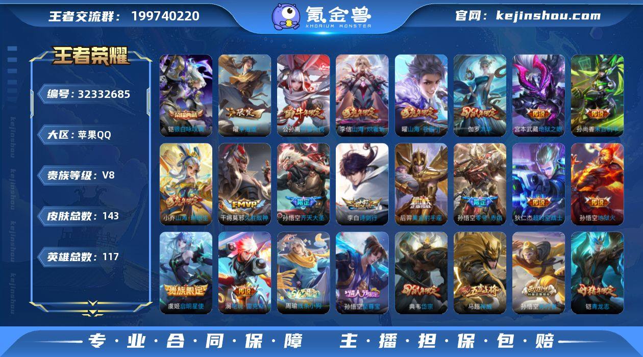 苹果Q-V8-永恒钻石IV段位-117英雄-143皮肤-1典藏皮肤-17传说-50史诗【英雄全皮】:敖隐全皮【荣耀典藏】:铠银白咏叹调【传说皮肤】:澜电玩雷克斯,孙悟空齐天大圣,小乔山海琳琅生,曜山海苍雷引,李信山海炽霜斩,李白诗剑行,曜李逍遥 ,公孙离祈雪灵祝,虞姬启明星使,孙悟空零号赤焰,伽罗太华,干将莫邪久胜战神,后羿黄金射手座,孙尚香末日机甲,宫本武藏地狱之眼,孙悟空地狱火,狄仁杰超时空战士【限定皮肤】:狄仁杰阴阳师,廉颇寅虎御盾,小乔山海琳琅生,赵云皇家上将,妲己时之彼端,鲁班七号乒乒小将,阿轲迷踪丽影,吕布御风骁将,元歌无心,夏侯惇朔风刀,曹操天狼征服者,典韦岱宗,马可波罗山海玄木吟,狄仁杰魔术师,狄仁杰万华元夜,项羽海滩派对,老夫子醍醐杖,关羽冰锋战神,程咬金演武夺筹,刘邦夺宝奇兵,韩信飞衡,花木兰青春决赛季,亚瑟潮玩骑士王,孙悟空至尊宝,孙悟空零号赤焰,孙悟空孙行者,孙悟空齐天大圣,牛魔奔雷神使,后羿辉光之辰,李元芳银河之约,李元芳云中旅人,虞姬启明星使,钟馗驱傩正仪,东皇太一逐梦之光,鬼谷子原初探秘者,铠青龙志,百里守约朱雀志,弈星混沌棋,公孙离祈雪灵祝,沈梦溪星空之诺,沈梦溪大漠名商,明世...