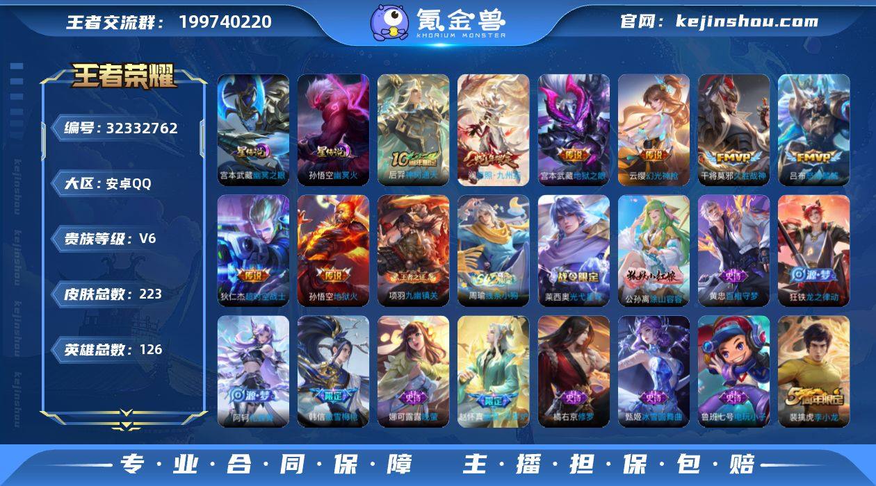 安卓Q-V6-最强王者段位-126英雄-223皮肤-9传说-55史诗【英雄全皮】:孙权全皮【传说皮肤】:韩信踏浪归,后羿神树通天,澜愿照九州拓,云缨幻光神枪,吕布怒海麟威,干将莫邪久胜战神,宫本武藏地狱之眼,孙悟空地狱火,狄仁杰超时空战士幽冥之眼 幽冥火 【限定皮肤】:虞姬夏日便利店,姜子牙天穹之誓,狄仁杰阴阳师,赵云皇家上将,墨子神迹守卫,孙尚香蔷薇恋人,庄周高山流水,高渐离死亡摇滚,高渐离玩趣恶龙,夏侯惇朔风刀,狄仁杰魔术师,狄仁杰万华元夜,达摩沙漠行僧,项羽海滩派对,老夫子醍醐杖,老夫子航海奇遇记,程咬金演武夺筹,韩信傲雪梅枪,兰陵王金庭之子,牛魔御旌,李元芳云中旅人,钟馗驱傩正仪,太乙真人华丽摇滚,鬼谷子原初探秘者,鬼谷子五谷丰年,苏烈千军破阵,百里玄策原初追逐者,弈星混沌棋,梦奇顽趣,沈梦溪大漠名商,明世隐疑决卦,裴擒虎李小龙,裴擒虎擒涛扼浪,米莱狄御霄,云中君纤云弄巧,盾山御銮,猪八戒西部大镖客,上官婉儿梁祝,鲁班大师探海日志,桑启海盐诗旅,艾琳女武神,阿古朵江河有灵,蒙恬荣光圣徽,鬼谷子天穹祈灯,沈梦溪龙舞盛年,刘邦剑破天穹,周瑜熔金海岸【年限皮肤】:澜愿照九州拓【赛季限定】:米莱狄御霄,牛...