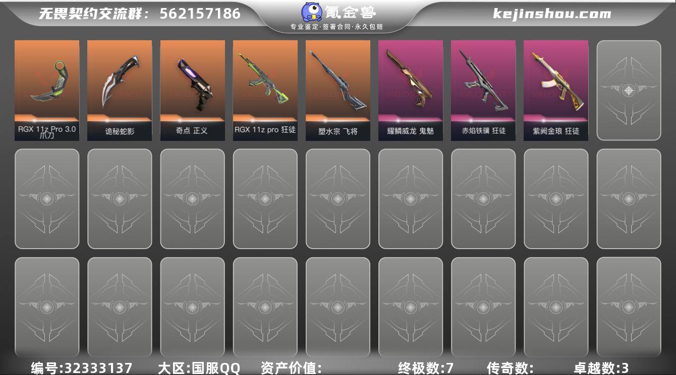 【英雄】:幻棱,炼狱,暮蝶,壹决,捷风,雷兹,不死鸟,贤者,猎枭,蝰蛇,零,芮娜,奇乐,尚勃勒,霓虹,夜露,K/O,盖可,黑梦【近战武器】:近战武器-剥皮小刀,近战武器-RGX 11z Pro//3.0 爪刀,近战武器-诡秘蛇影 军刀【狂徒】:狂徒-RGX 11z Pro,狂徒-紫阙金琅,狂徒-赤焰铁骥,狂徒-诡秘蛇影【幻影】:幻影-末日之翼【戍卫】:戍卫-折光棱晶【飞将】:飞将-塑水宗,飞将-末日之翼【莽侠】:莽侠-诡秘蛇影【奥丁】:奥丁-末日之翼【判官】:判官-诡秘蛇影【骇灵】:骇灵-无限竞技【蜂刺】:蜂刺-折光棱晶【标配】:标配-折光棱晶【正义】:正义-奇点,正义-传奇制造,正义-纳米打击【鬼魅】:鬼魅-耀鳞威龙,鬼魅-诡秘蛇影,鬼魅-扑棱扑棱,鬼魅-星云暗涌【短炮】:短炮-末日之翼【卡面】:孵化小能手:破壳鸭 卡面,终章:激斗汉堡 卡面,进入射程 卡面,《双城之战》拥抱 卡面,精灵大战 卡面,欢迎来到底城 卡面,南瓜盛典 卡面,无畏契约:暮蝶 卡面,树懒大作战 卡面,流星兵团 卡面,虹吸式咖啡壶 卡面,无畏契约GO!第一卷:芮娜 卡面,无畏契约GO!第一卷:零 卡面,化茧成蝶 卡面,无垠星环 卡面,《双城之战》金克丝 卡面,没有什么能逃过我的眼睛 卡面,...