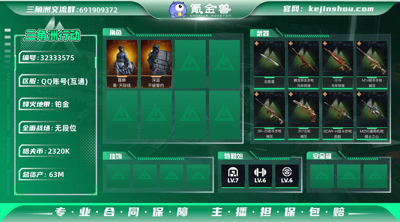 【PTSJZ3320】总资产(M):63M/哈夫币(K):2320K/哈夫币(K):2320K/传说枪皮数:19/全面战场等级:2_段位:无段位/烽火地带等级:60_段位:铂金/露娜-黑·天际线/深蓝-不破誓约(S6)/近战-北极星/近战-黑鹰/M4A1突击步枪-阿米娅/AK-12突击步枪-特斯拉线圈/SCAR-H战斗步枪-启航/腾龙突击步枪-捞点薯条/腾龙突击步枪-马年祥瑞/K437突击步枪-北极星/UZI冲锋枪-特斯拉线圈/SR-3M紧凑突击步枪-特斯拉线圈/勇士冲锋枪-能天使-午夜邮差/QCQ171冲锋枪-北极星/M250通用机枪-骑士之心/M14射手步枪-电锯惊魂/M14射手步枪-缄花/SR-25射手步枪-缄花/AWM狙击步枪-捞点薯条/.357左轮-缄花/G18-马年祥瑞/93R-捞点薯条/复合弓-黑-天际线/AKM突击步枪-林中猎手/ASh-12战斗步枪-无极限/K416突击步枪-缄默情歌/腾龙突击步枪-猎鳄行动/K437突击步枪-守护者/MP5冲锋枪-战术竞备/P90冲锋枪-紧急戒备/SMG45冲锋枪-阿萨拉特攻/SR-3M紧凑突击步枪-战术竞备/勇士冲锋枪-深海恐惧/勇士冲锋枪-工业狂潮/MP7冲锋枪-守护者/M1014霰弹枪-林中猎手/PKM通用机枪-蝮蛇/M250通用机枪-囚徒/Mini-14射手步枪-守护者/SV-98狙击步枪-林中猎手/M700狙击步枪-蝮蛇/AWM狙击步枪-无极限/沙漠之鹰-曙光/复合弓-守护者/M14射手步...