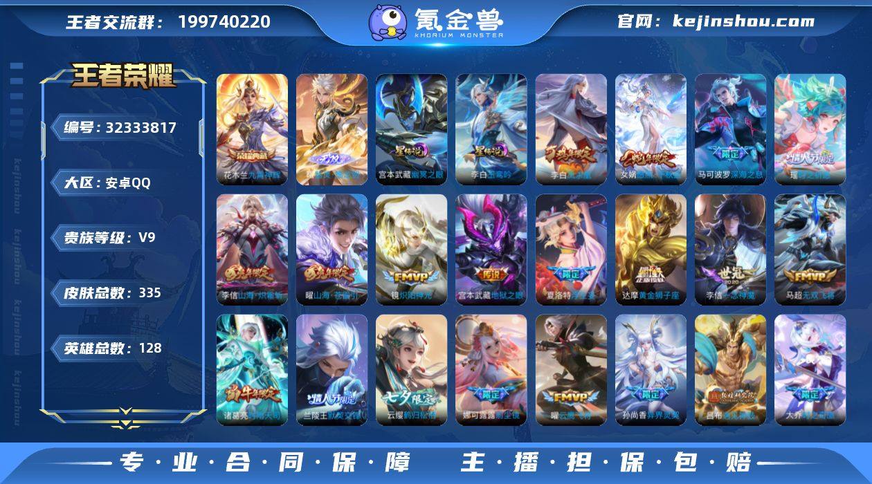 安卓Q-V9-至尊星耀II段位-128英雄-335皮肤-1典藏皮肤-1无双-40传说-105史诗 【英雄全皮】:孙权全皮,金蝉全皮,影全皮 【荣耀典藏】:花木兰九霄神辉 【无双皮肤】:曜器灵螭龙剑 【传说皮肤】:女娲愿照千秋盛,云缨幻光神枪,大乔时之奇旅,吕布遇见神鼓,宫本武藏惊梅引,云缨鹤归松栖,马可波罗妄想实况,东皇太一灼幽烈阳,诸葛亮鹤羽星尊,张飞百相守梦,夏洛特浮生妄,花木兰燃星之曲,项羽无限倾心,伽罗炽翼辉光,曜山海苍雷引,李信山海炽霜斩,李白诗剑行,不知火舞绯月行,百里守约碎云,娜可露露前尘镜,马可波罗深海之息,马超无双飞将,露娜启示之音,瑶时之祈愿,孙尚香异界灵契,小乔音你心动,兰陵王默契交锋,诸葛亮时雨天司,镜炽阳神光,虞姬启明星使,曜云鹰飞将,李信一念神魔,刘备时之恋人,干将莫邪久胜战神,达摩黄金狮子座,花木兰冠军飞将,梦奇胖达荣荣,李白凤求凰,宫本武藏地狱之眼,狄仁杰超时空战士 【限定皮肤】:白起狰,蔡文姬夏日便利店,虞姬夏日便利店,姜子牙天穹之誓,狄仁杰阴阳师,虞姬凯尔特女王,赵云皇家上将,赵云引擎之心,墨子降魔,妲己时之奇旅,嬴政白昼王子,孙尚香异界灵契,庄周云端筑梦师,庄周高山流水,高渐离...