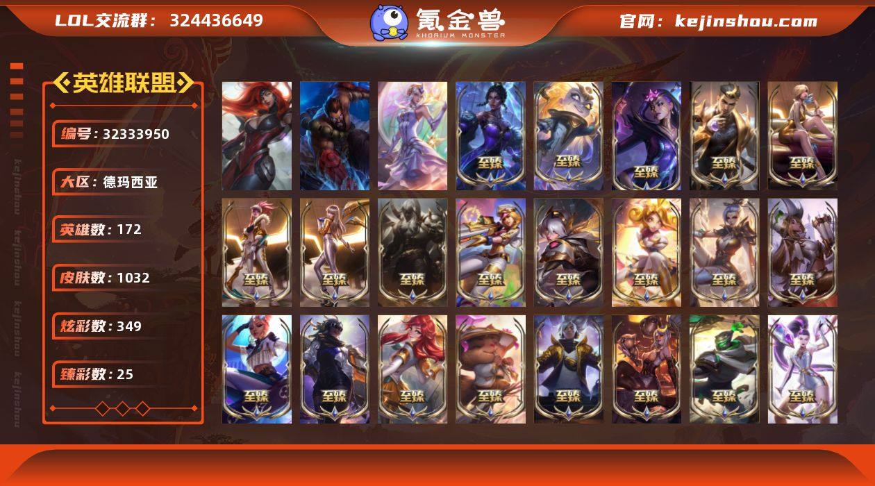 t37791【德玛西亚】 1032皮肤 349炫彩 25臻彩 56神话/172限定/101传说/172英雄 账号等级:989 云顶神话:2 【重要头像】爱意绵绵 爱情鸽 心型钥匙 觅心之翼奎因 泳池派对凯特琳 泳池派对佐伊 救生圈 灵魂莲华阿狸炫彩 灵魂莲华莉莉娅炫彩 灵魂莲华厄斐琉斯炫彩 电玩女神厄运小姐 电玩女神娑娜 沐浴震惊 可爱安妮 冠军之箭艾希凯旋盛装 不错哦 至臻剪纸仙灵希维尔 至臻青花瓷丽桑卓 至臻海珀利安小队迦娜 水晶圣骑艾希头 【重要皮肤】北极星神梅尔至臻 永恒星灵佐伊至臻 暗星女王黛安娜至臻 T1杰斯至臻 心之钢永恩至臻 斗魂觉醒萨科至臻 花仙使者卡特琳娜至臻 剪纸仙灵希维尔至臻 青花瓷丽桑卓至臻 北极星使者沃里克至臻 海珀利安小队X09星环灵风迦娜至臻 星之守护者辛德拉至臻 星之守护者艾克至臻 西部魔影猎天使恶魔泰隆至臻 幻灵战斗猫金克丝至臻 青花瓷拉克丝至臻 真实伤害亚索至臻 真实伤害赛娜至臻 灵魂莲华提莫至臻 黑夜使者凯隐至臻 征服者贾克斯至臻 焰执事布兰德至臻 KDA二代卡莎至臻 KDA一代卡莎至臻 KDA伊芙琳至臻 KDA伊芙琳2022至臻 KDA阿卡丽至臻 KDA阿卡丽2022至臻 战斗学院拉克丝至臻 战斗学院拉克丝2022至臻...