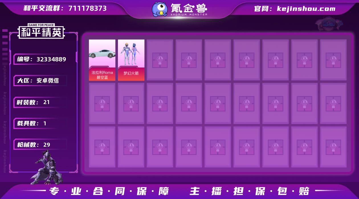 安卓 手Q-6粉装-5特效枪-1载具-42511热力值-4印记-97套装-135枪皮 【稀有载具】:仰望U9(赤霞丹朱) 【特效枪等级】:Kar98K-创世·救赎(四级),Kar98K-巳巳如意(四级),Mk14-盛世惊鸿(三级),SVD-月影灵韵(三级),DP-28-圣堂之誓(六级) 【优质套装】:角色-歌者泠鸢,粉装-飒粉甜心,粉装-炫光之旅,粉装-蜜语绒猫,套装-创世·救赎,角色-女娲灵识 【稀有套装】:套装-龟仙人,套装-巳巳如意,套装-雏菊兔兔,套装-萝兰蝴蝶,套装-小熊娃娃,角色-光矢逐梦,套装-燕燕于飞,套装-鱼渊荷华,套装-晶辉守护 【优质武器皮肤】:SCAR-L-黄金龙骨,Vector-创世·救赎,Kar98K-巳巳如意,Kar98K-创世·救赎,Mk14-盛世惊鸿,SVD-月影灵韵,DBS-创世·救赎,DP-28-圣堂之誓 【稀有武器皮肤】:AKM-江南烟雨,AKM-破晓战魂,AKM-霓虹街区,AKM-龙的传人,M16A4-幻世战舞者,SCAR-L-炫彩节奏,SCAR-L-玉兔迎春,SCAR-L-红色方程式,SCAR-L-黄金龙骨,M416-糯团青竹,M416-蓝色火焰,GROZA-彩虹符号,GROZA-影袭,GROZA-懵萌河马,AUG-天降萌叽,AUG-甜蜜菠萝,AUG-耀粉歌者,QBZ-彩虹符号,M762-天降萌叽,M762-萌物绒绒,Mk47-妙红点点,Mk47-炫光之旅,G36C-镜域双华,G36C-懵萌河马,AC-VAL-天降萌叽,AC-VAL-快闪甜心,蜜獾-天降萌叽,Famas-镜域双华,UZI-啾咪啾咪,UZI-天降萌叽,UZI-红色方程式,UMP45-夜灯,UMP45-涂山之恋,UMP45-蓝色火焰,Vector-焰鹰斗篷,Vector-生命誓言,汤姆逊-天降萌叽,汤姆逊-炫彩节奏,汤姆逊-智耀战神,P90-快闪甜心,P90-巳巳如意,M24-炫彩节奏,AWM-焰鹰斗篷,AWM-圣堂之誓,SKS-炫彩节奏,VSS-星之彼岸,Mini14-炫彩节奏,SLR-彩虹符号,SLR-墨龙九天,莫辛纳甘-懵萌河马,AMR-妙红点点,AMR-墨龙九天,M417-惊鸿侠骨,MK20-H-快闪甜心,M200-惊鸿侠骨,S686-生命誓言,S686-巳巳如...
