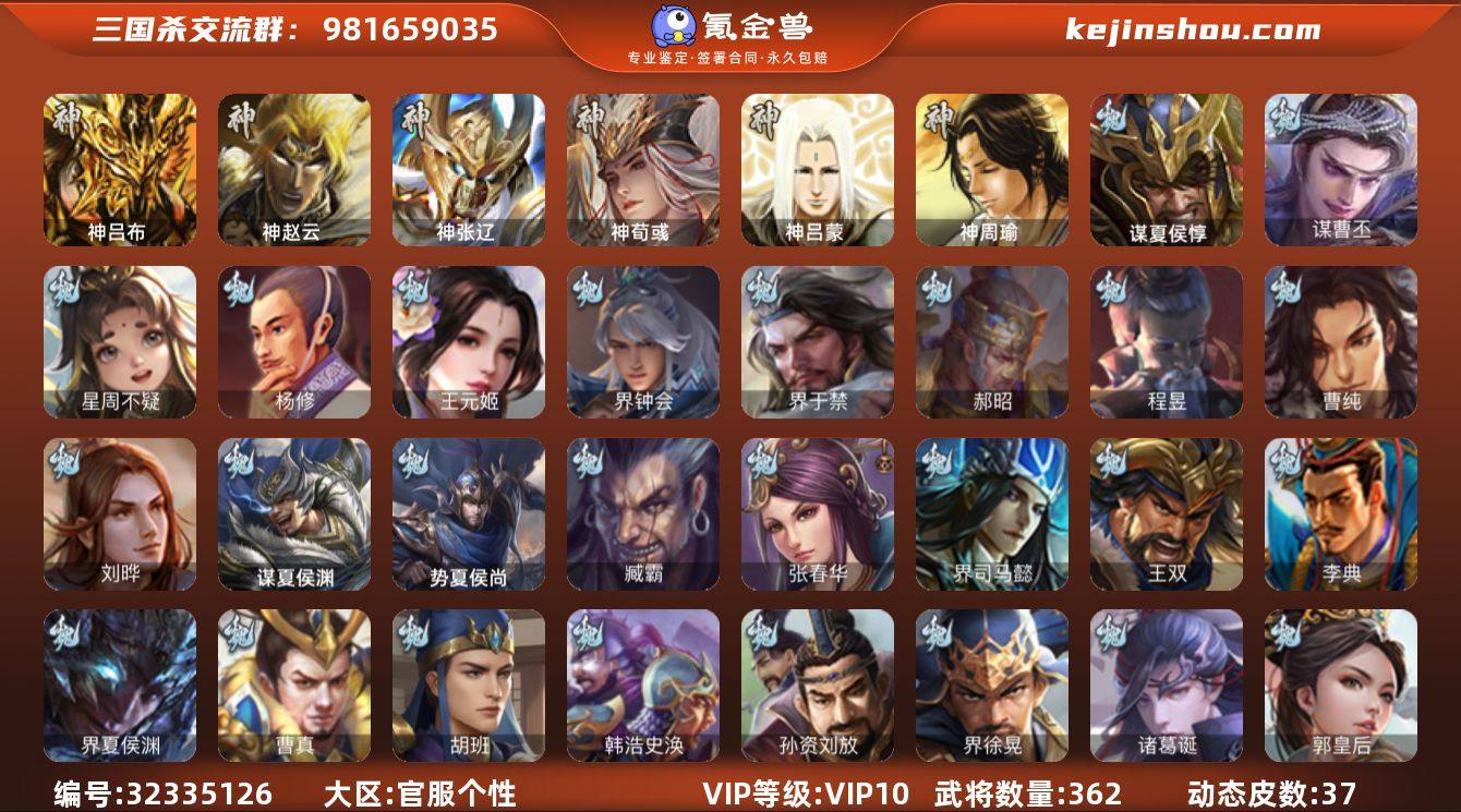 官阶:大将军;VIP等级:VIP10;史诗武将数量:38;动态皮肤数量:37;武将总数:362;史诗宝珠数量:0;将魂数量:2333;神将:4;魏国史诗武将:18;蜀国史诗武将:4;吴国史诗武将:6;群史诗武将:13