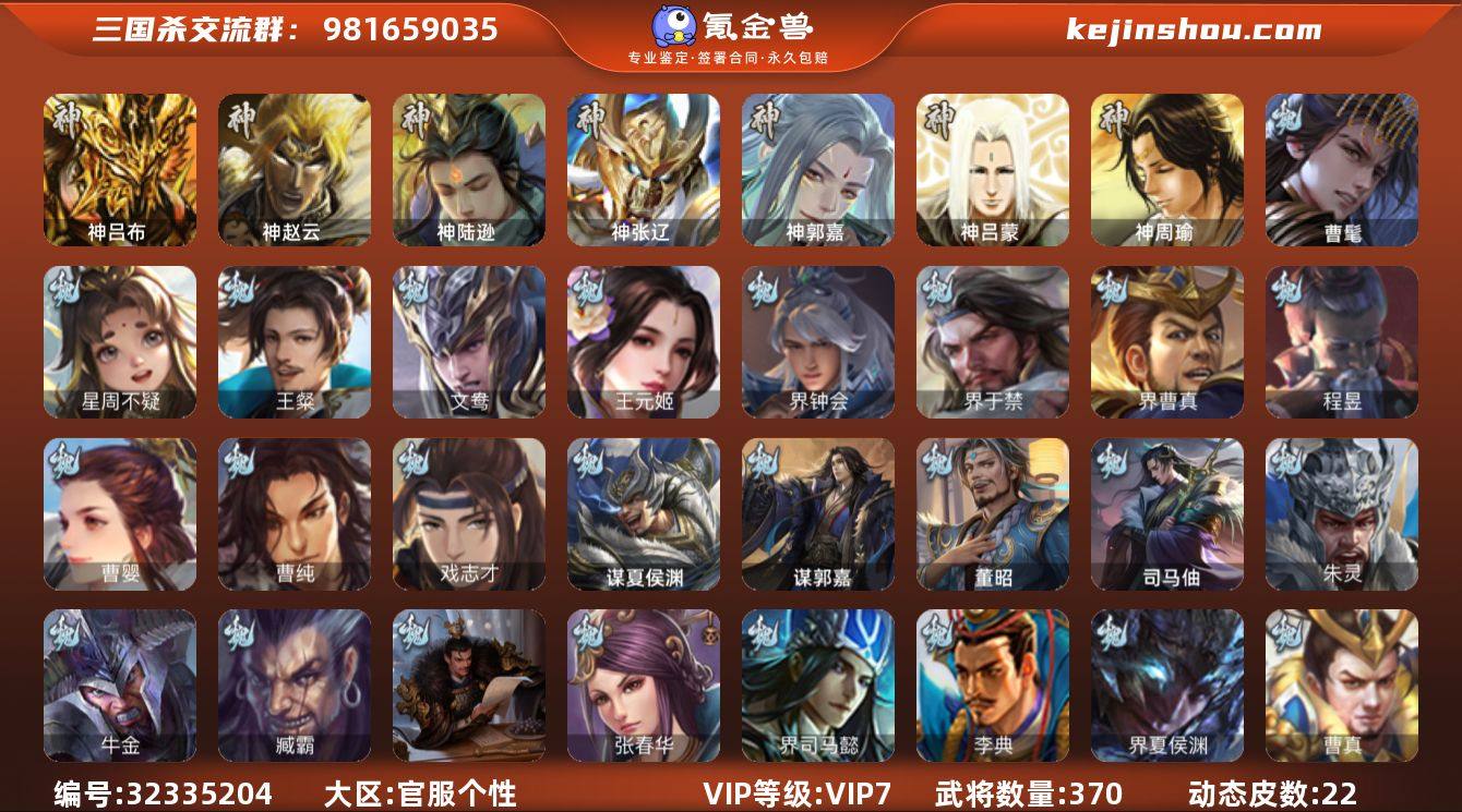 VIP等级: VIP7 官阶: 大将军 武将数量: 370 动态皮肤数量: 22 神将: 神郭嘉,神陆逊,神吕布,神张辽,神赵云,神吕蒙,神周瑜 魏国武将: 戏志才,曹纯,曹婴,程昱,界曹真,界于禁,界钟会,王元姬,文鸯,王粲,唐咨-魏,张辽,SP蔡文姬,SP关羽,SP贾诩,SP姜维,卞夫人,曹昂,曹操,曹冲,曹洪,曹丕,曹仁,曹叡,王异,张恭,鲁芝,界满宠,曹休,界曹植,满宠,荀攸,王基,钟繇,郭嘉,荀彧,杜畿,界郭嘉,崔琰,界曹丕,界荀彧,朱灵,界甄姬,吕虔,界王异,界许褚,界郭淮,陈群,界邓艾,界典韦,袁涣,李通,乐进,辛宪英,郭淮,郭皇后,毌丘俭,夏侯惇,曹植,司马朗,谋于禁,界曹操,星周不疑,许褚,界张辽,谋徐晃,张郃,钟会,文聘,曹彰,界夏侯惇,诸葛诞,司马懿,甄姬,界徐晃,徐晃,孙资刘放,韩浩史涣,胡班,曹真,典韦,界夏侯渊,夏侯渊,李典,于禁,邓艾,界司马懿,张春华,孟达-魏,臧霸,牛金,朱灵(国战),曹髦,司马伷,董昭,谋郭嘉,谋夏侯渊 蜀国武将: 花鬘,界黄忠,谯周,沙摩柯,王平,诸葛瞻,谋马超,谋赵云,徐庶,界魏延,杨仪,界关羽,界诸葛亮,邓芝,界伊籍,费祎,严颜,界黄月英,界张嶷,赵云,张松,彭羕,李丰,界刘备,界刘禅,谋姜维,刘封,糜竺,黄月英,关羽,王甫赵累,吴懿,祝融,张飞,黄皓,陈震,魏延,界周仓,马忠,界法正,糜夫人,界孟获,刘禅,界赵...
