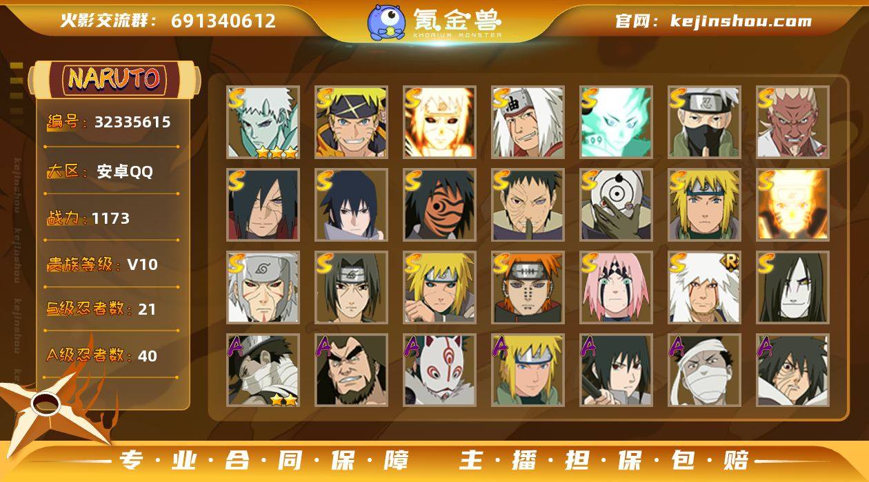47512|安卓QQ 3101区 1173w战力 v10 S忍者数:21 A忍者数:40 时装16 剩余1266点券安卓QQ 3101区 S忍者数:21 A忍者数:40 忍者:宇智波带土「十尾人柱力」,漩涡鸣人·宇智波佐助,波风水门「九喇嘛连结」,自来也「传说中的三忍」,大筒木舍人「最终章」,旗木卡卡西「须佐能乎」,艾「忍界大战」,宇智波斑「秽土转生·解」,宇智波佐助「永恒万花筒」,神秘面具男「红夜之刃」,春野樱「忍界大战」,漩涡鸣人「九喇嘛连结」,宇智波带土「忍界大战」,自来也「舞之豪杰」,宇智波斑「白面具」,千手扉间「秽土转生」,波风水门「秽土转生」,宇智波鼬「须佐能乎」,佩恩「天道」,波风水门,大蛇丸,小南「神驹佑将」,旗木卡卡西「神威对决」,迈特凯「青春爆炸」,巳月「仙人模式」,大野木「侠隐江湖」,机械鸣人「初始形态」,土台「忍界大战」,桃地再不斩「秽土转生」,神农「羁绊」,宇智波泉奈,蝎「绯流琥」,李洛克「忍界大战」,旗木卡卡西「幻之真容」,日向雏田「最终章」,漩涡博人「桃式显现」,小南「漂泊浪客」,角都「秽土转生」,日向宁次「忍界大战」,长十郎「六代目水影」,长门「青年」,艾「青年」,神秘面具男「忍者之路」,波风水门「青年」,宇智波佐助「须佐能乎」,桃地再不斩「漂泊武士」,宇智波...