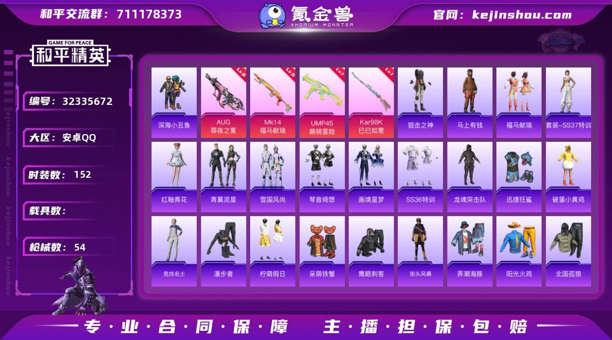 和平有aug升级枪6级,还有金羽头盔,深海小丑鱼主套和鲨鱼裤。王者v7 200多个皮肤。皮肤都是超质量。