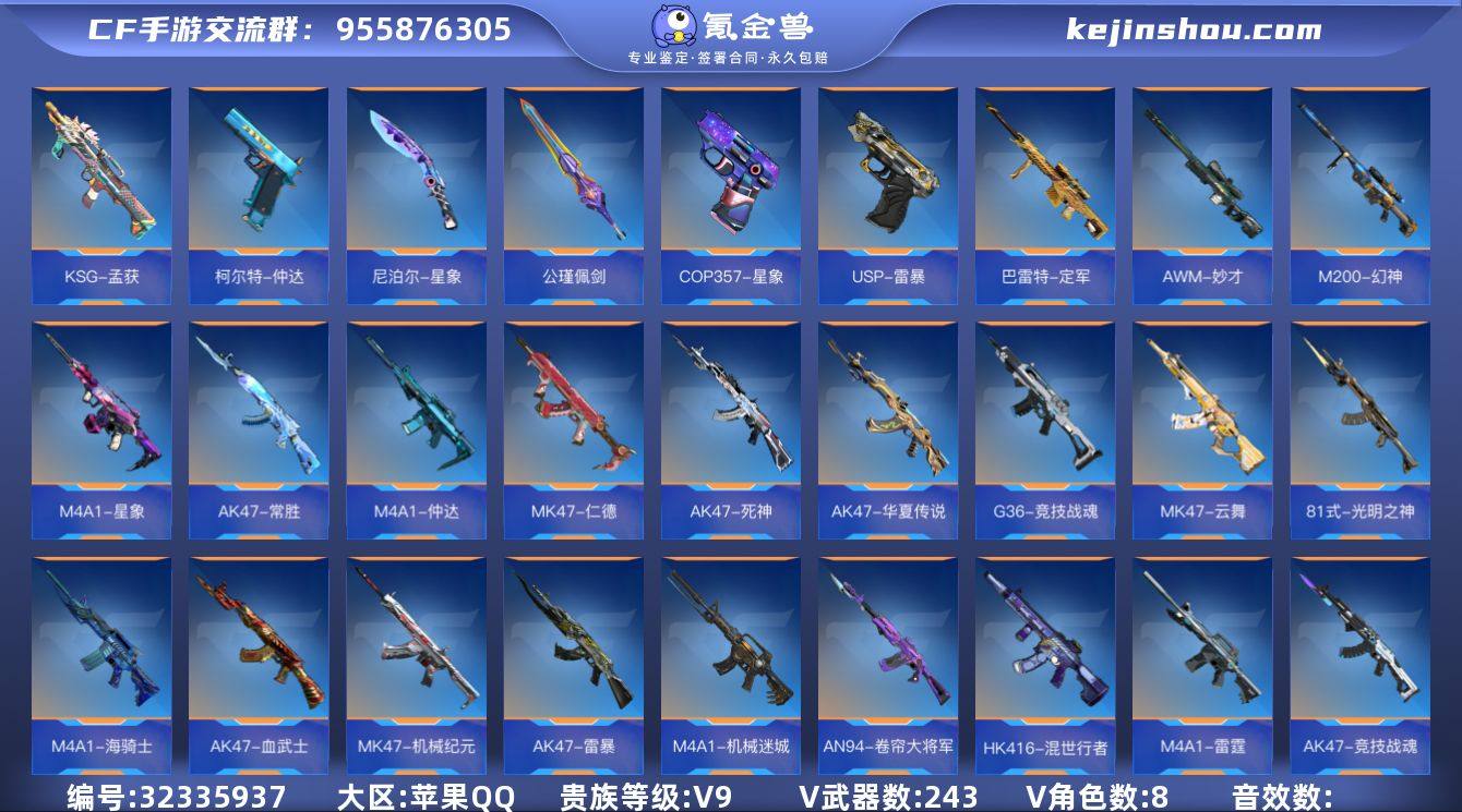 FC-LVCAY3 苹果QQ,成人号:是,角色等级:177,实名:有修改人脸机会/实名是本人,段位:枪王,VIP等级:V8,V武器数量:615,V角色数量:19,V总数量:294,王者武器数:34,万化数量:454, 【人物角色】孙悟空,洛克,关小雨,海滩夜玫瑰,子涵,由乃,瞳,潜龙队,娜塔莎,樱,太阳神-曦,大老师,堕天使,周年庆纪念赛斯,复仇者,运动宝贝兰,铁骑,洛伊,夏日灵狐,暗影,春节兰,零,圣诞灵狐,刀锋-2017,魅惑灵狐,审判者,曼陀罗,白狼,幻影,夜玫瑰,赛斯,潘多拉,猎狐者,奥摩,斯沃特,秦师,云悠悠-心动起点,龙妹,木兰,奥妹,蜀雪,月神,变装舞会兰,零-水下丽影,关小雨-X,麻雀,春,斯薇特, 【王者武器】王者之业,王者之竞手雷,王者之竞烟雾弹,王者之竞闪光弹,王者之兽,唐刀-华夏传说,王者之势闪光弹,王者之心手雷,王者之兽手雷,王者之心烟雾弹,王者之心闪光弹,王者之翼闪光弹,王者之兽闪光弹,王者之影闪光弹,王者之圣闪光弹,王者之兽烟雾弹,王者之影烟雾弹,王者之圣烟雾弹,王者之势烟雾弹,王者之翼烟雾弹,闪光弹-雷霆王者,烟雾弹-雷霆王者,王者之心,王者之影,王者之魄,王者之势,王者之怒,王者之魂,王者之锋,王者之击,王者之烈,王者之迹,王者之仞,王者之隐, 【至尊套装】兽至尊,怒至尊,心至尊,魄至尊, 【带V枪械】王者之锋-HeartShot,加特林-炼狱-怒魔,王者之心闪光弹-HeartShot,王者之心烟雾弹-HeartShot,G36-竞技战魂,M4A1-哈迪斯,M4A1-海骑士,M4A1-赛博雷神,M4A1-七色宝葫,M4A1-机械迷城,M4A1-黑龙钰-子涵,M4A1-仲达,M4A1-龙血,AK47-幸运日觉醒-千变,M4A1-樱龙·二觉,沙鹰-火麒麟-寒霜,M4A1-卧龙,M4A1-死神,M4A1-黑龙,M4A1-黑骑士,M4A1-雷神,47-机械纪元,气手枪-炼狱-怒魔,47-仁德,AK47-血武士,AK47-雷麒麟,AK47-心动次元觉醒...