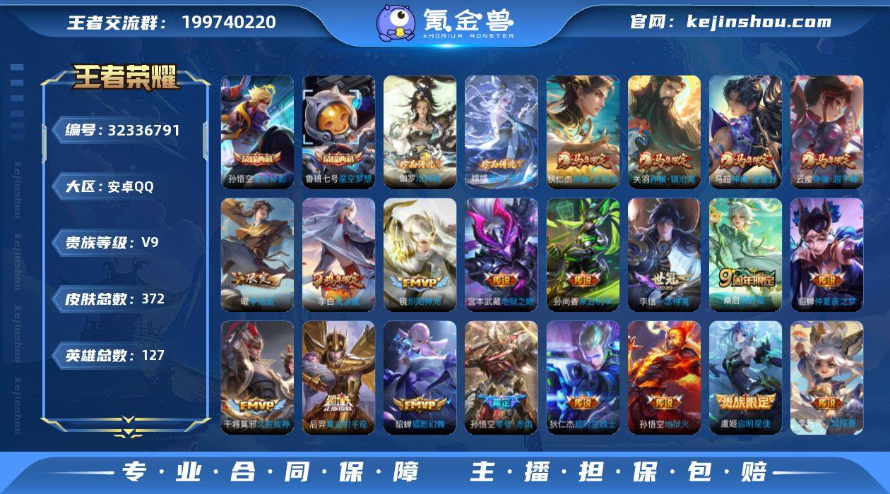 V9 4典藏 1无双 23传说 2星元 347皮肤 127英雄 【4水晶】孙尚香-杀手不太冷,孙悟空-全息碎影,夏侯惇-无限飓风号,貂蝉-幻阙歌【1无双】李白-碎月剑心【23传说】达摩-黄金狮子座,狄仁杰-超时空战士,伽罗-太华,干将莫邪-久胜战神,宫本武藏-地狱之眼,后羿-黄金射手座,花木兰-冠军飞将,李白-凤求凰,李信-一念神魔,吕布-天魔缭乱,梦奇-胖达荣荣,孙尚香-末日机甲,孙悟空-地狱火,瑶-时之祈愿,虞姬-云霓雀翎,虞姬-启明星使,张良-黄金白羊座,亚连-落雪白狼,澜-逐花归海,曜-云鹰飞将,桑启-鸣野蒿,云缨-幻光神枪,后羿-神树通天【2星元】瑶-时之愿境,宫本武藏-幽冥之眼【89史诗】鬼谷子-五谷丰年,赵云-未来纪元,金蝉-唐三藏,狂铁-电玩高手,明世隐-吟游魔法,阿轲-节奏热浪,阿轲-迷踪丽影,安琪拉-心灵骇客,白起-星夜王子,百里守约-特工魅影,百里玄策-原初追逐者,不知火舞-魅语,蔡文姬-舞动绿茵,曹操-幽灵船长,蔡文姬-繁星吟游,嫦娥-如梦令,程咬金-功夫厨神,妲己-女仆咖啡,妲己-魅力维加斯,大乔-猫狗日记,狄仁杰-魔术师,狄仁杰-鹰眼统帅,典韦-蓝屏警告,貂蝉-圣诞恋歌,伽罗-箭羽风息,公孙离-无限星赏官,宫本武藏-鬼剑武藏,韩信-白龙吟,韩信-飞衡,后羿-辉光之辰,后羿-如梦令,花木兰-水晶猎龙者,橘右京-修罗,黄忠-火炮绅士,铠-曙光守护者,铠-青龙志,兰陵王-暗隐猎兽者,兰陵王-驯魔猎人,李白-千年之狐,李元芳-逐浪之夏,李元芳-银河之约,廉颇-地狱岩魂,刘邦-德古拉伯爵,刘禅-绅士熊喵,刘禅-天才门将,露娜-紫霞仙子,鲁班七号-电玩小子,鲁班七号-狮舞东方,吕布-圣诞狂欢,吕布-末日机甲,马可波罗-逐梦之星,墨子-金属风暴,墨子-龙骑士,娜可露露-晚萤,上官婉儿-梁祝,裴擒虎-李小龙,司马懿-暗渊魔法,孙策-猫狗日记,孙尚香-水果甜心,孙悟空-至尊宝,王昭君-偶像歌手,西施-诗语江南,夏侯惇-乘风破浪,项羽-苍穹之光,小乔-缤纷独角兽,雅典娜-冰冠公...