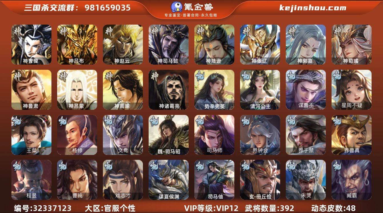 VIP等级: VIP12 官阶: 大将军 武将数量: 392 动态皮肤数量: 48 神将: 神曹操,神郭嘉,神陆逊,神吕布,神司马懿,神荀彧,神张辽,神赵云,神吕蒙,神周瑜,神诸葛亮,神鲁肃 魏国武将: 戏志才,曹纯,程昱,界曹真,界于禁,界钟会,司马师,魏-司马昭,文鸯,杨修,王粲,徐庶,张辽,SP蔡文姬,SP关羽,SP贾诩,SP姜维,SP庞德,卞夫人,蔡贞姬,曹昂,曹操,曹冲,曹洪,曹丕,曹仁,曹叡,王异,张恭,鲁芝,界满宠,曹休,界曹植,满宠,荀攸,王基,钟繇,蒯越蒯良,郭嘉,荀彧,阮慧,杜畿,界郭嘉,崔琰,界曹丕,界荀彧,朱灵,界甄姬,吕虔,界陈群,界王异,界许褚,界郭淮,华歆,陈群,界邓艾,界典韦,界曹休,谋甄姬,司马孚,袁涣,李通,乐进,辛宪英,郭淮,夏侯惇,曹植,司马朗,谋于禁,界曹操,星周不疑,许褚,界张辽,谋徐晃,张郃,钟会,文聘,曹彰,界夏侯惇,诸葛诞,司马懿,甄姬,界徐晃,徐晃,孙资刘放,韩浩史涣,胡班,曹真,谋曹丕,典韦,界夏侯渊,夏侯渊,李典,于禁,王双,邓艾,界司马懿,张春华,孟达-魏,臧霸,朱灵(国战),玄·毌丘俭,清河公主,司马伷,谋夏侯渊,势辛宪英 蜀国武将: 董允,谯周,沙摩柯,王平,赵襄,诸葛瞻,谋马超,谋赵云,徐庶,界魏延,杨仪,吕凯,界关羽,界诸葛亮,邓芝,界伊籍,严颜,界黄月英,界张嶷,赵云,张松,彭羕,李丰,界刘备,刘封,糜...