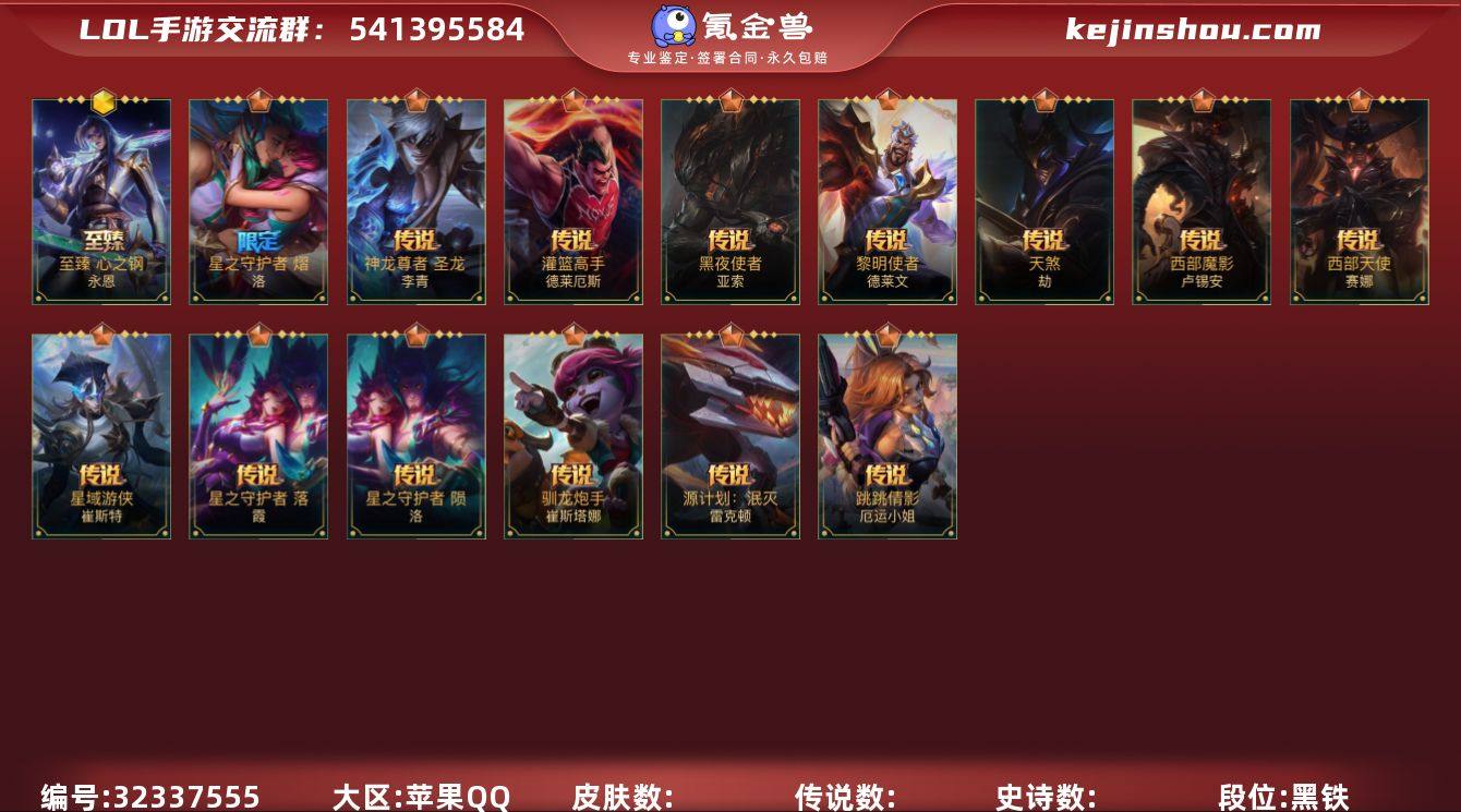 【编号22069可秒换绑】店长推荐特价处理精品号 109英雄-267皮肤 【神话皮肤】:龙的传人 李青 【限定皮肤】:龙的传人 李青,掠星魔刃 卡萨丁,水晶玫瑰 永恩,关羽 云长 泰达米尔 【传说皮肤】:神王 盖伦,源计划:净化 薇恩,暗星尊 烬,黑夜使者 亚索,天煞 劫,西部魔影 卢锡安,日蚀骑士 蕾欧娜,欧米伽小队 幽灵特工 提莫,星之守护者 陨 洛,神拳 李青,福牛守护者 厄运小姐,灌篮高手 德莱厄斯,神王 德莱厄斯,西部天使 艾希,黎明使者 锐雯,战斗学院 伊泽瑞尔,最终BOSS 维迦,灵魂莲华 锤石 【史诗皮肤】:钢铁军团 盖伦,战斗学院 拉克丝,惊悚派对 阿木木,殇之机器人 阿木木,摄魂猎手 凯隐,霸天战士 雷恩加尔,雷喵喵尔 雷恩加尔,星域先知 卡尔玛,丧尸 努努和威朗普,地狱行者 孙悟空,暗星 奥莉安娜,泳池派对 奥莉安娜,腥红之月 黛安娜,无限烈焰 黛安娜,恶魔之刃 泰达米尔,猎龙勇士 赵信,霸天异形 卡兹克,暗星 卡兹克,清剿小队 金克丝,烘焙童谣 悠米,圣诞老人 布隆,源计划:升华 烬,西部牛仔 烬,腥红之月 烬,灭迹行者 烬,霸天龙神 奥瑞利安·索尔,圣龙 奥瑞利安·索尔,腥红之月 崔斯特,未来战士 崔斯特,弹幕天使 卡莎,K/DA ALL OUT 卡莎,神龙尊者 玉境灵龙 卡莎,玉剑传说 苍鸾 莫甘娜,K/DA ALL OUT 伊芙琳,猎龙勇士 潘森,清剿小队 潘森,铁血女忍 阿卡丽,K/DA ALL OUT 阿卡丽,源计划:暗影 阿卡丽,源计划:火 菲奥娜,泳池派对 菲奥娜,玉剑传说 无双 菲奥娜,福牛守护者 菲奥娜,海之歌 萨勒芬妮,银河魔装机神 安妮,福牛守护者 安妮,源计划:风 亚索,灵魂莲华 亚索,电玩女神 阿狸,K/DA ALL OUT 阿狸,幻梦甜心 阿狸,源计划:阴 劫,死亡誓约 劫,武神 贾克斯,灵能特工 凯尔,屠龙勇士 凯尔,未来战士 卢锡安,源计划:山 蕾欧娜,欧米伽小队 魔鬼伞兵...