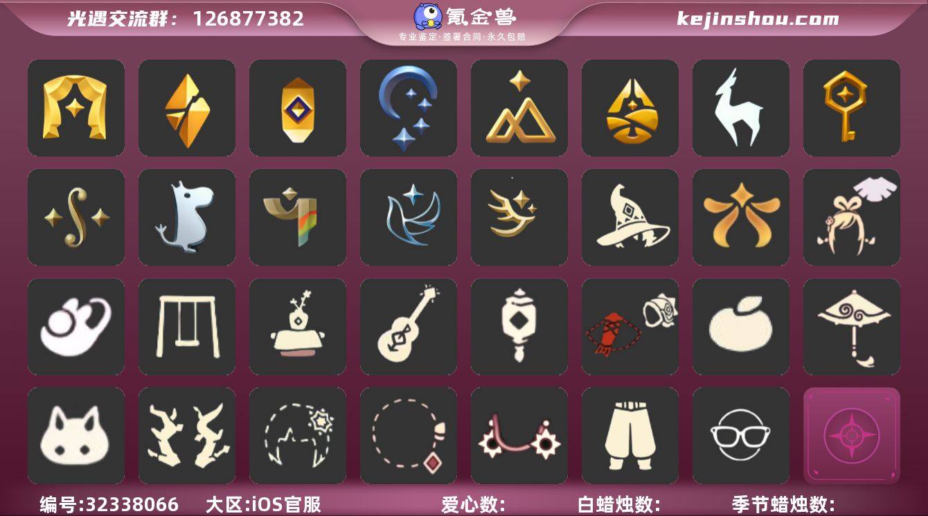 账号类型: 手机账号 季节已毕业: 表演季,破晓季,夜行季,追忆季,拾光季,归巢季,九色鹿季,筑巢季,二重奏季,姆明季,彩染季,青鸟季,迁徙季 完成地图: 云野,雨林,霞谷,暮土 珍稀物品: 白枭,彩虹围巾 礼包: 巫师,欧若拉之翼,绊爱,兔子鞋,秋千,茶桌,吉他,灯笼,鲤鱼套,橘子,红伞,兔子,枯角,雪花,彩虹耳钉,日光耳环 裤子: 武士裤 面饰: 黑框眼镜